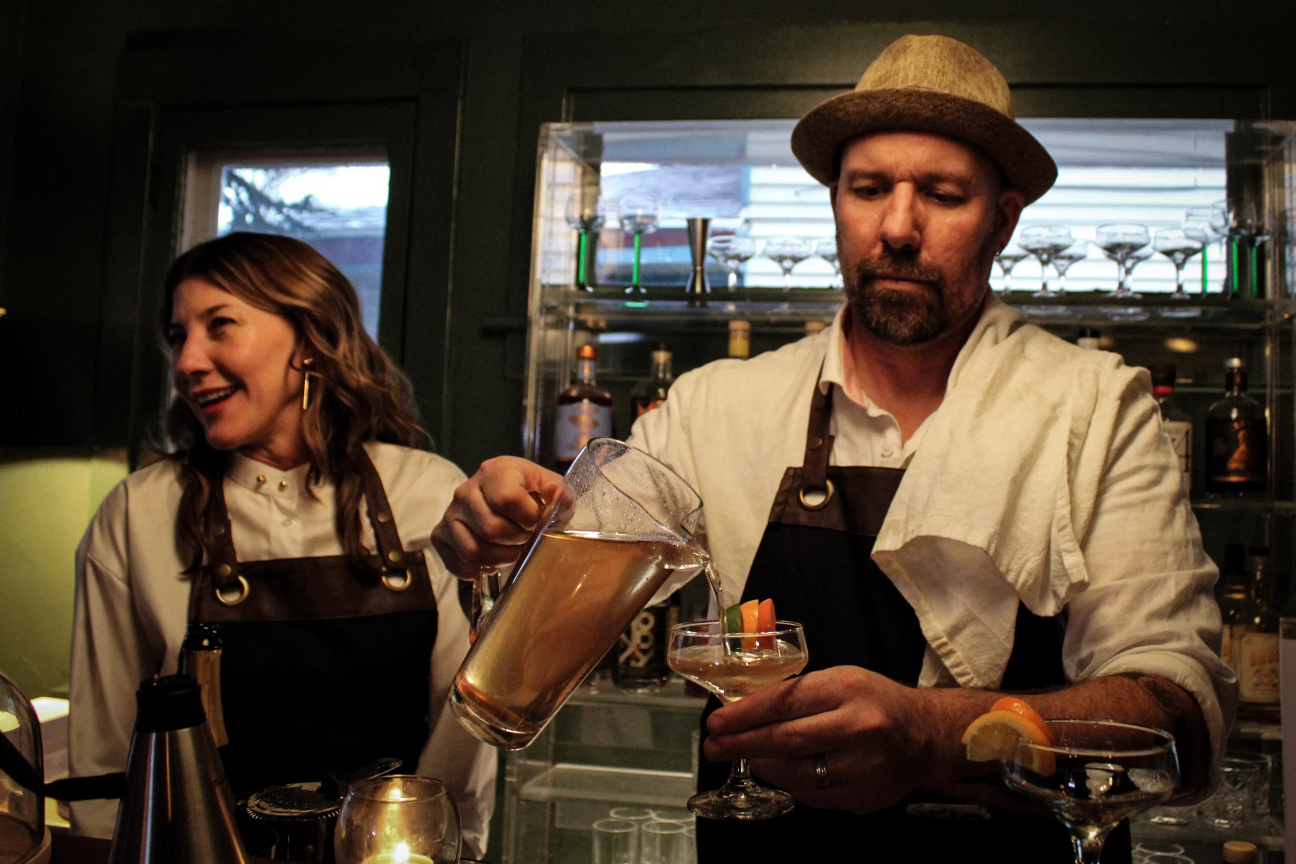 My favorite drink of the night was The J. Strang, which had a little kick and little spice — it was fun and gorgeous. I also think the Lyre’s spiced cane and mint tea dusted lime on top cleared my sinuses. As I watched Matthew make this drink, Kelly shared a funny childhood memory with me. Both Kelly and Matthew used to play bartender at their grandparents’ home, and the painting that hangs on the wall next to the bar belonged to their grandparents. I felt a sweet, full-circle moment within that story.