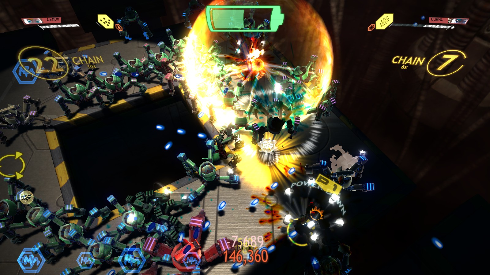 You start with four different androids—Holly, Lemon, Coral and Cactus—each equipped with a pair of weapons to take out the multitudes of machines. Your weapon gets more power from the small orbs that baddies drop after you junk them—busting those bastards up is much easier when you get that weapon fully powered up. My most frequently played was Holly and her Seeker weapon. I could hide behind walls and still manage to shoot the shit out of the hordes of machines headed my way. It’s paired with an awesome cannonball shooter to clear out a whole line of machines.