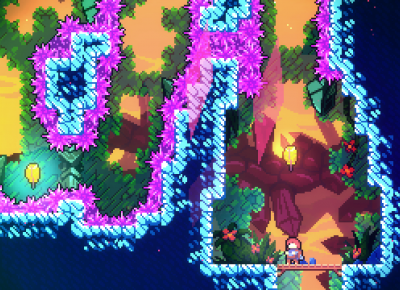 As you explore the mountain as Madeline, you find a mysterious mirror. When you look into your reflection, the reflection takes you by surprise and passes into your own world, dressed in purple and red. She tells you that she is “Part of You” and begins to chase you, and so begins a section where this Part of You follows every move you make and will kill you, and so the time to internalize a challenge and execute is drastically cut. This person, this part of you, whatever it is, would probably be the closest thing the game has to an antagonist, and Celeste’s greatest strength is that it never explicitly defines what this Part of You actually is.