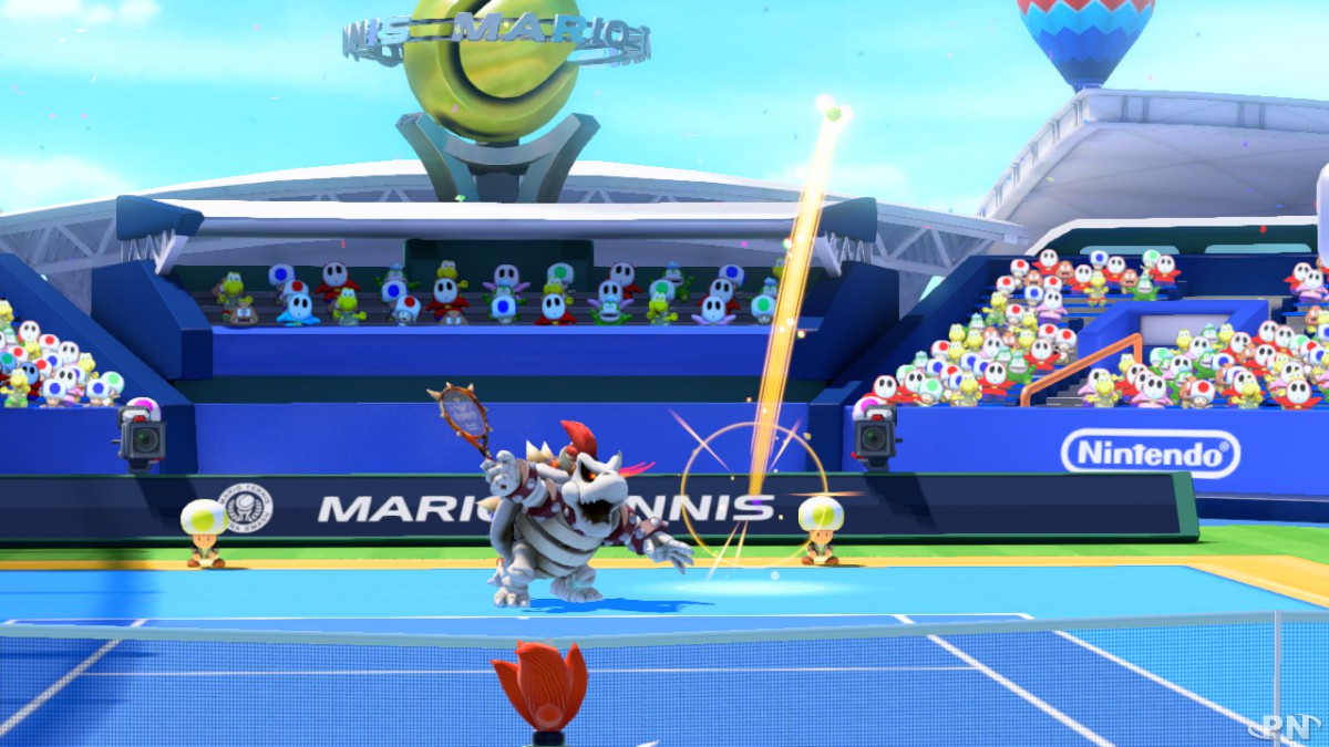 The biggest addition in Mario Tennis: Ultra Smash is the Mega Battles. Instead of a simple match, Toads throw mega mushrooms from the sidelines that supersize you into quite the formidable foe. You’ve got more power and obviously more reach, but you’re more susceptible to getting smacked in the face by a ball. While it’s quite a spectacle, it’s more of a distraction than anything. There’s a small scene every time someone runs into a mega mushroom, whether it’s right in the middle of your stroke or you rushing to get the ball, stopping the game dead in its tracks.