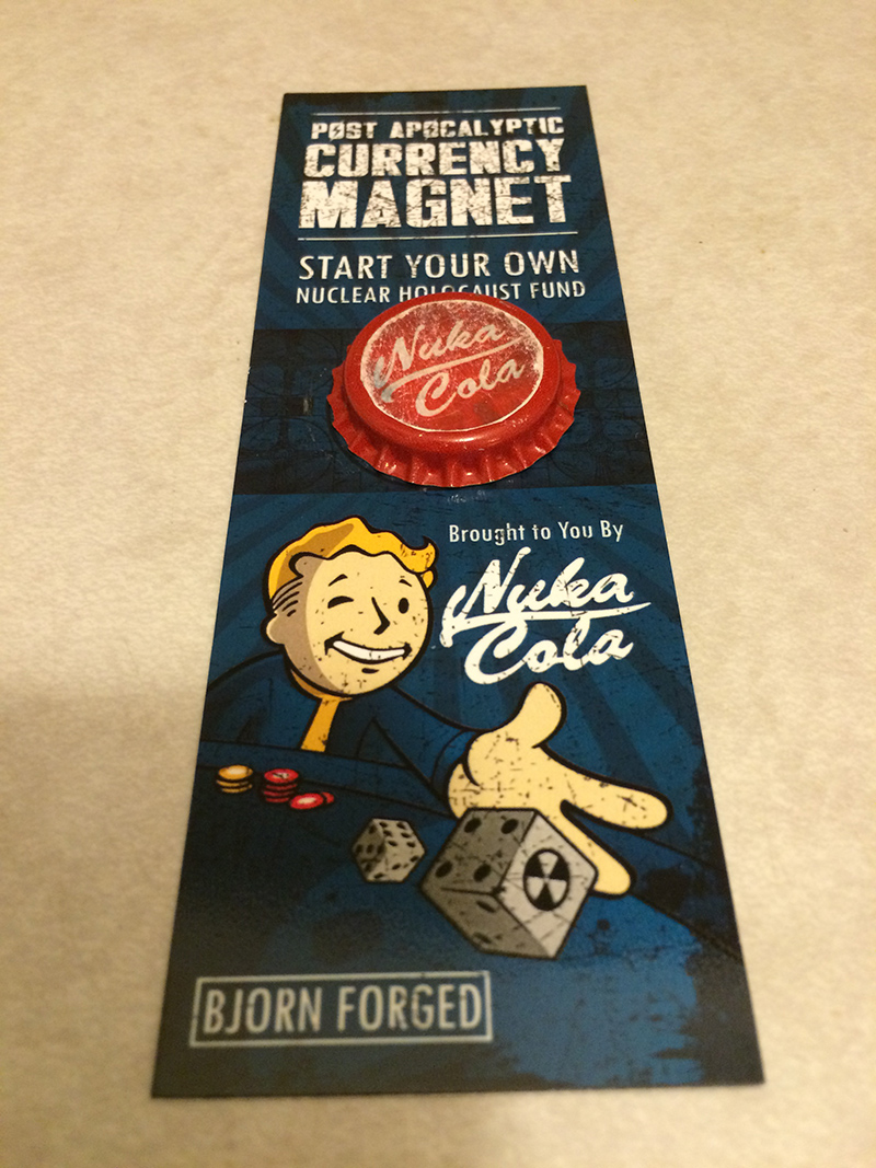 Geek Fuel August 2015 – Post-Apocalyptic Currency MagnetIf you’ve ever played Fallout of any generation, you know how important it is to keep bottle caps on you at all times. Included in this pack is the highest currency you can have in a world of constant despair, a Nuka Cola bottle cap, which is a mighty powerful magnet. As a bonus, the card it’s attached to makes a great bookmark.