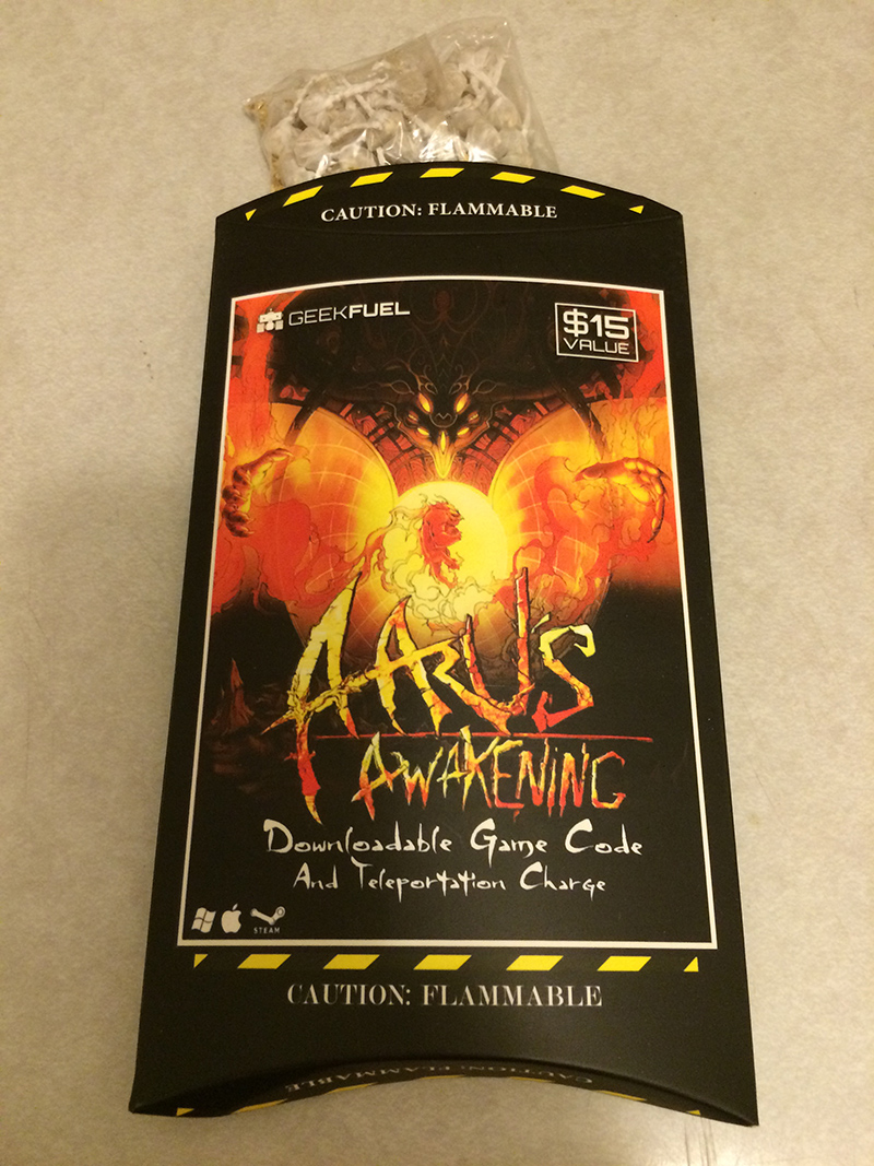 Geek Fuel August 2015 – Aaru's AwakeningThe video game this month is a Steam copy of Aaru’s Awakening, a platformer where you go through an epic journey in harsh landscapes as an adventurous mythical creature that looks like a sloth that breathes fire. It’s an awesome game with a lot of challenges that remind me of Shovel Knight at times—well worth the download for fans of the genre. The strange addition to this game was a set of snapper fireworks, which doesn’t make much sense to me, but hey, fun thing for the kids to mess with.