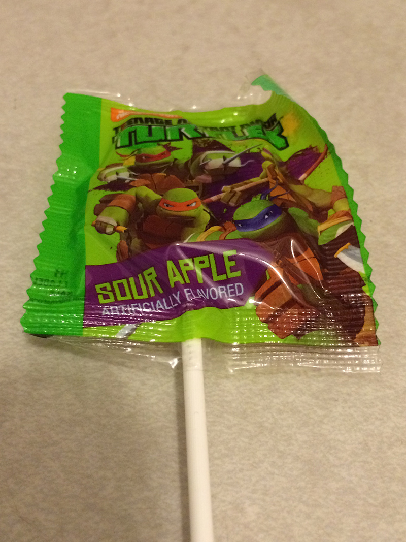image606When I was growing up, the Ninja Turtles were on EVERYTHING—including cereal, which I’m sure contributed greatly to my skills of beating their arcade game while dressed as Donatello for Halloween—but I digress. To my knowledge, they didn’t make suckers, so this was a pleasant treat. The sour apple taste is alright, but the weird part of the sucker was that parts of it started turning white after a few minutes, so the food coloring isn’t all that great.