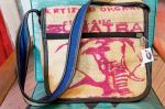 This particular 15 inch messenger bag is made of a Sumatra Rare coffee burlap sack (now I am craving a cup). Both the strap and pockets are lined with royal blue fabric that tie in with the hot pink print of an elephant on the outside flap. However, each bag is one of a kind. The lining is different and some of the graphics are extremely rare, so you don’t ever have to worry about running into someone with the same bag as you.