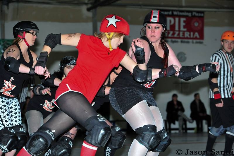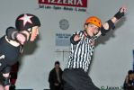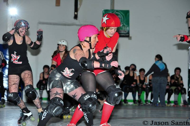 As some of you may know, The Derby Depot is, in fact, a warehouse—and therefore made of concrete floors and concrete walls—making it quite difficult to heat. So I schlepped my head cold–ridden tuckus into the freezing den to watch some season-ending holiday derby. The Red Rockettes had their fall session bout, which surprisingly fell on a weekday, and more surprising was the turnout. The Derby Depot was pretty packed for a Thursday night game, or maybe it just seemed fuller because the crowd’s large parkas and coats took up more space than usual.