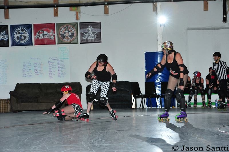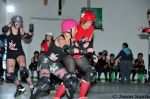 A few jams in, Candy Pains finally got some points on the scoreboard, but not without difficulty as Duchess of Destruction kept getting knocked out of play, finally had enough and called off the bout after scoring her four points.