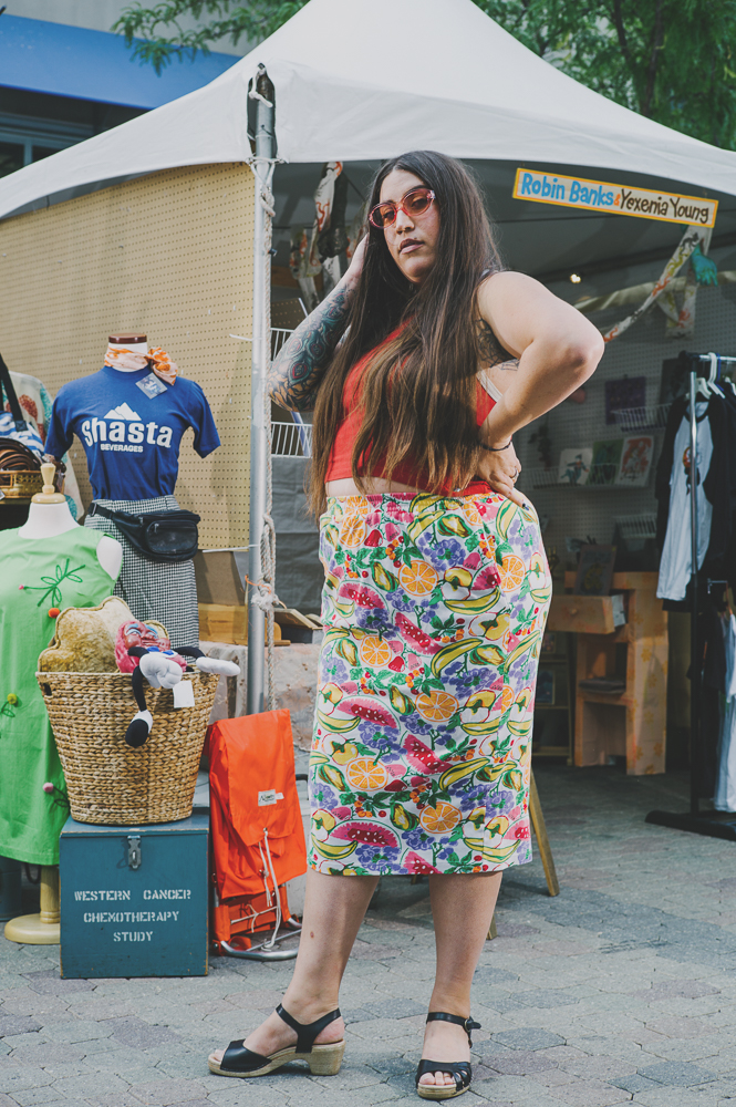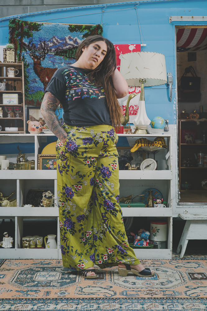“I’ve always loved vintage. I’ve thrifted since high school. Being a plus-size person it’s hard to find clothing. Especially 15–20 years ago, it was really hard to find cool pieces in plus size—so I thrifted trying to find alternative ways,” says Whitmore. “So I have a really good eye when it comes to finding things.”
