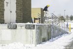 Being in between the Am teams and the pro teams pretty much means you have to bust your ass all the time, which is exactly what Larson does. Since none of his sponsors are cutting him checks yet (and most landlords don’t accept shred gear as rent money), you can usually catch him scanning tickets up at Snowbird full-time. Like many a pro before him, he’s working at a resort for his pass and shredding for his sponsors for gear. When Larson isn’t up at the ‘Bird checking passes, he’s usually cruising around the city, looking for new urban spots, flexing that creative muscle, finding things no one has hit yet. Lately, Larson has been out and about filming with the Lick the Cat crew and making edits to send to his sponsors. Hopefully, he’ll have enough footage to score a part in the Lick the Cat video at the end of the season. With any luck, all of this hard work he’s put in will pay off, so he’ll be able to flip the ‘Bird and fully claim pro-status.