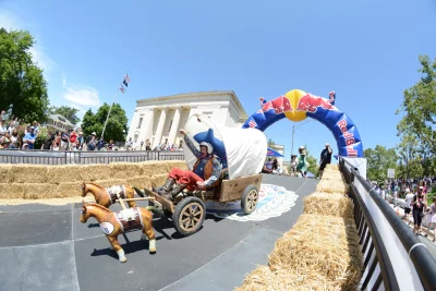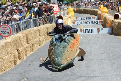 Beyond the beloved energy drink that supposedly “gives you wings,” Red Bull has launched itself into a household name in entertainment. Behind each taurine-laced sip is a multi-million dollar enterprise armed to the teeth in motocross, daredevils, rodeos, racing and record contracts with one of its biggest musicians being the indie rock band AWOLNATION. If there’s a facet for something appealing, there’s a chance Red Bull has grabbed it by the horns. The same goes with taking the fun-loving, homebrewed activity of soapbox racing, which Red Bull has turned into a national competition. The rules are simple: Build an out-of-the-box racer, take it down a steep incline track of hay bales and obstacles and make sure to cross the finish line in one piece. Easy enough, right? Now, throw in a panel of celebrity judges, both local and international, like Olympian climber Natalia Grossman and The Secret Lives of Mormon Wives star Mayci Neeley (though she dropped out at the last minute…too many dirty Diet Dr. Peppers from the night before, I bet). And to top it off, add 50,000 spectators to join in on the excitement. This is no longer a Little Rascals derby — this is a duel to the death! Boogity, boogity, let’s go racing!