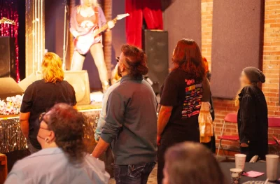 Entering the main venue, a poster painted in red, white and blue stripes extended the length of the stage, with the message “Visibility Matters” spray painted in large, black letters. This lent a handcrafted feel to the event, similar to a backyard production—and the parents are out of town. Musical performances, slam poetry and burlesque numbers roused the room, bringing guests to their feet on more than one occasion. Drag act Notta Genda performed in a patent leather bodice touting a saxophone, and when they unfurled a colorful flag with a message of protection for trans kids, the audience cheered loudly in agreement. As they danced and lip-synced to “Tell Me Where the Freaks At” by Timmy Trumpet & Savage, the room responded vigorously, the so-called freaks happily owning the title and singing in tandem.