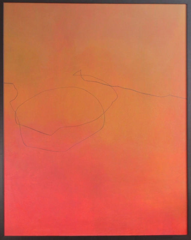 He says, “This one [the painting above us] is the record of me turning around. I change hands, with my back to the canvas, and then continue to the other side without breaking the line. [The form that resulted] was a complete surprise.” He says he’s looking to approximate, as closely as he can, something unintentional in these “records of moments.” Then he adds another layer––he attempts to finish the pieces such that no brush strokes are visible. Sometimes he forms the compositions around the automatic line drawings, sometimes he “buries” them. “The great thing about oil painting is that you can obliterate anything. But, painting something out in one of these paintings is really hard because I am going for no brush strokes,” says Paul. One in the series has shown at the Utah Arts Council Annual Show, and Paul has plans to mount an exhibition of the series soon.
