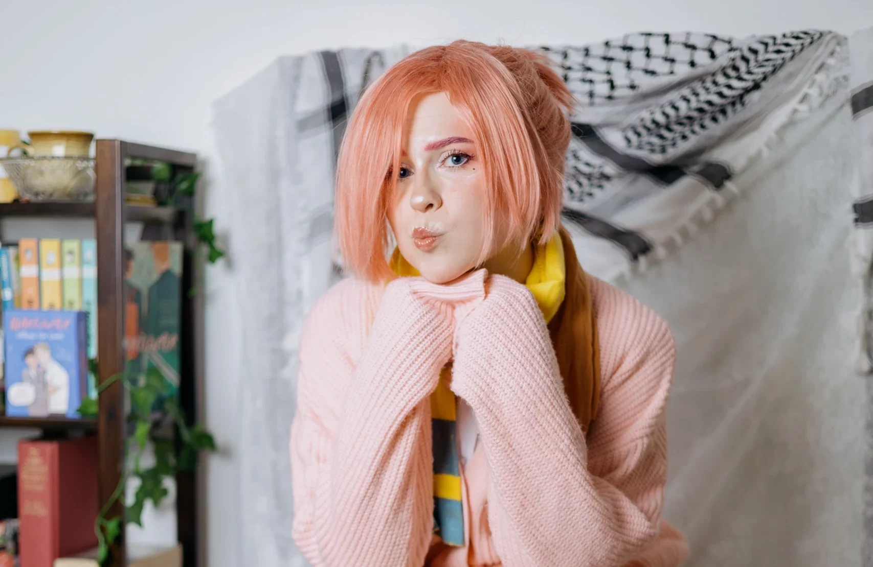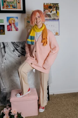 Mitsuba Sousuke cosplay: The newest addition to her collection, this costume was inspired by the anime Jibaku Shounen Hanako-kun. However, the peachy sweater and candied wig was built to be a symbol of feminine empowerment for Smith. The whole fit encourages her to dig deeper to become her true self. “Growing up, I hated pink so much,” Smith says. “So letting myself be girly and being a pink bubblegum ghost boy was liberating.”