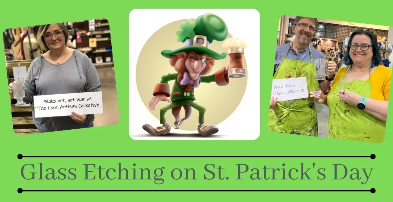 Sign up online https://localartisancollective.com/events/glass-etching-a-beer-mug-for-st-patricks-day-march-15th-from-500-to-700/