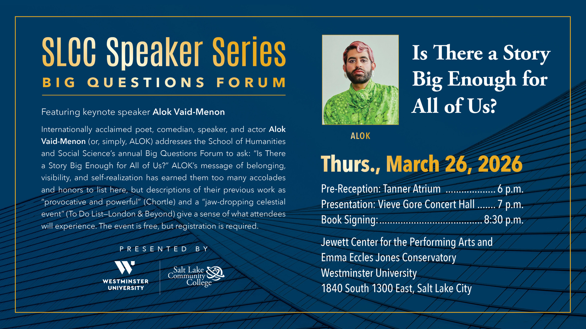 Westminster University is pleased to host SLCC’s School of Humanities and Social Sciences annual Big Questions Forum with internationally acclaimed poet, comedian, speaker, and actor Alok.