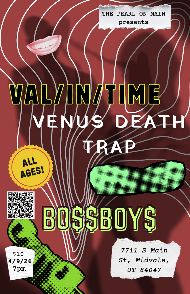 THURSDAY, April 9th, Come enjoy VAL/IN/TIME will take the stage, with VENUS DEATH TRAP, and B0$$B0Y$ opening at the legendary Pearl on Main. This is an ALL AGES event! A chance to bring grandmas and babies for an unforgettable event of rap, rock, and indie goth!