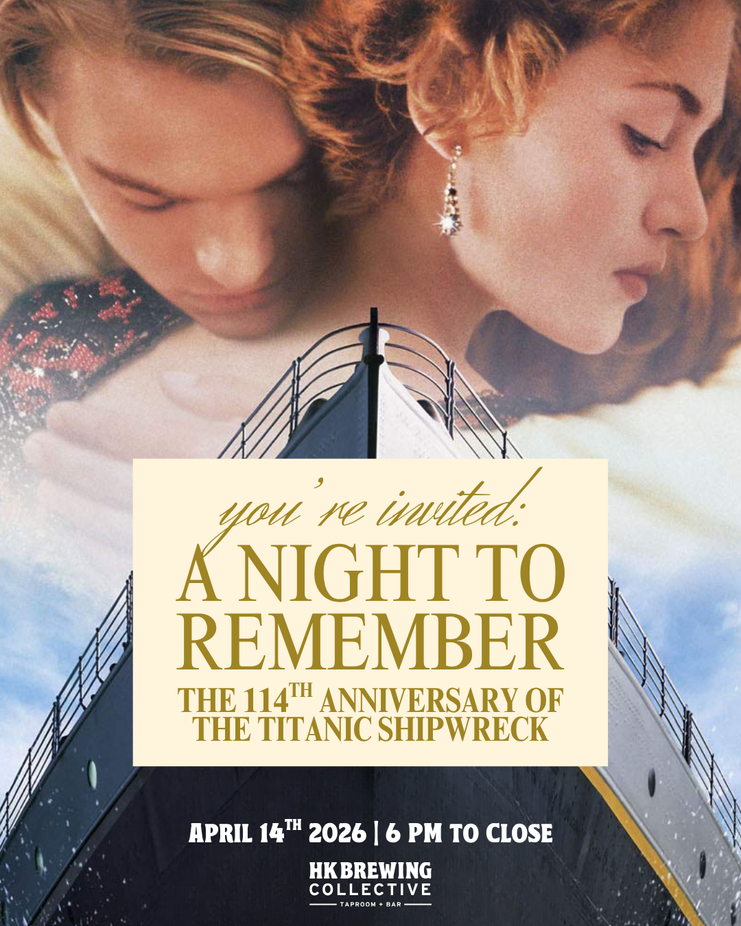 April 14th marks the 114th anniversary of the Titanic’s doomed voyage, so we’re partnering with bar pal & Titanic aficionado Vincent to honor it with a movie night in the taproom!