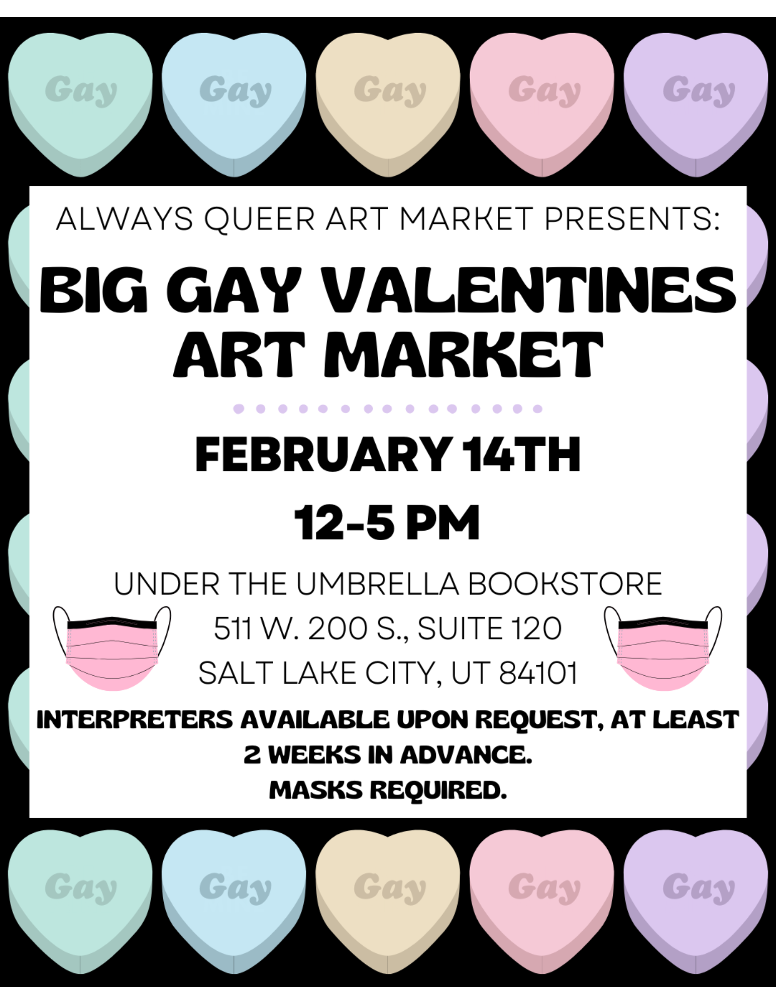 The Always Queer Big Gay Valentines Market is happening at Under the Umbrella Bookstore on February 14th, 12-5 pm. This event will feature 5 local vendors.