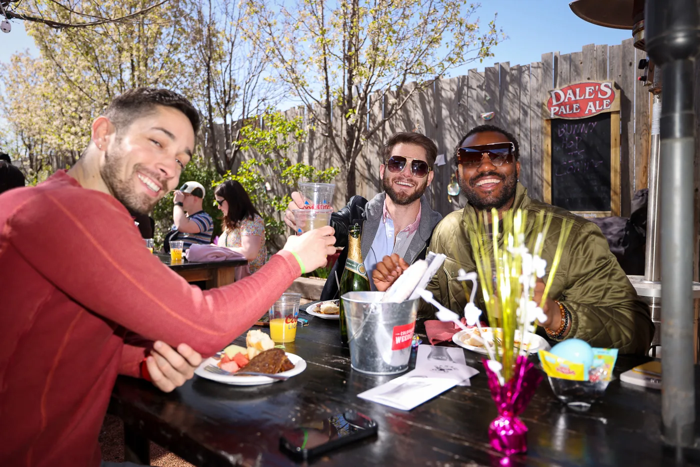 (L-R) Adrien, Devon and Max blend their own Mimosas, and they’re going a little light on the OJ. Max is the Bunny Hop veteran in the group while Adrien and Devon are attending for the first time. Photo: John Barkiple.
