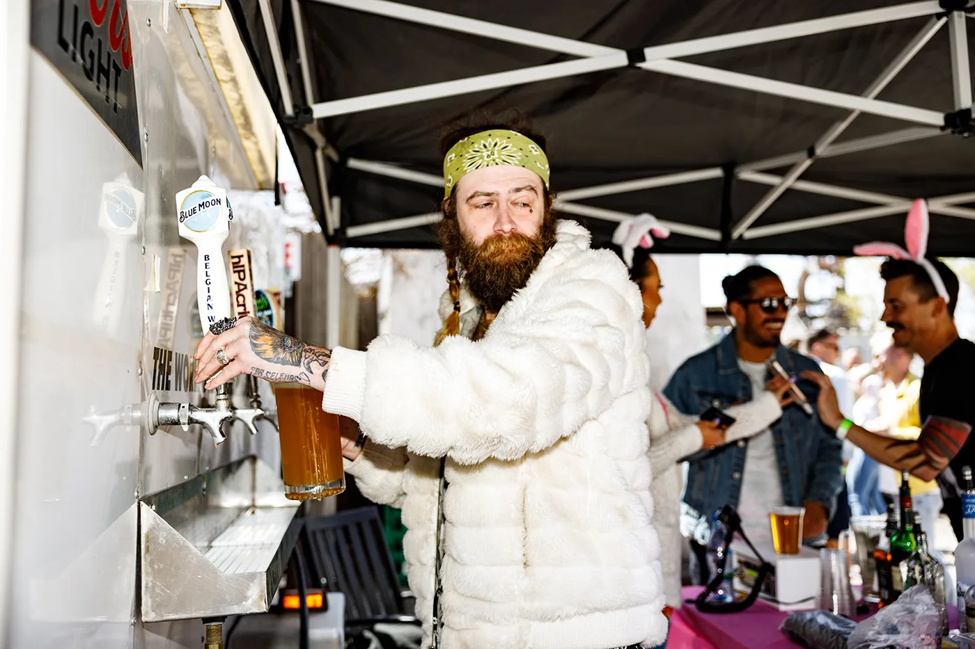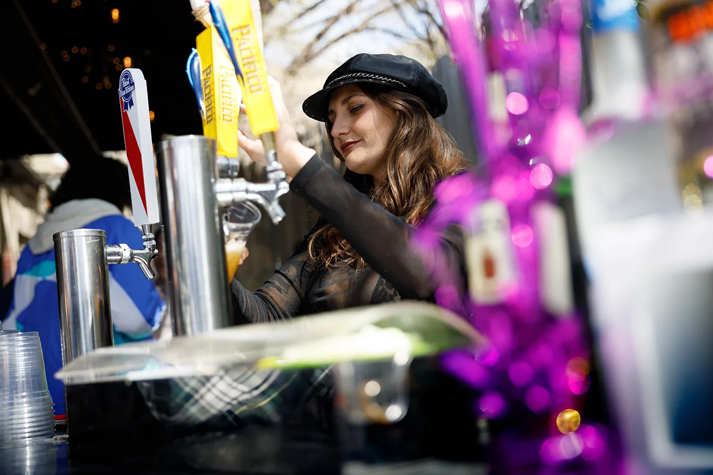Bartender pouring beer on the patio at the Bunny Hop. Photo: John Taylor.
