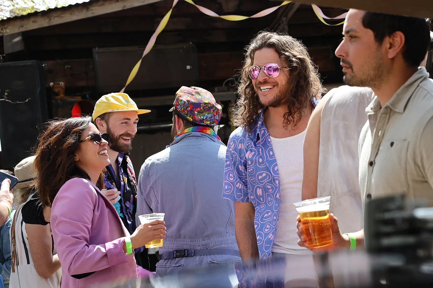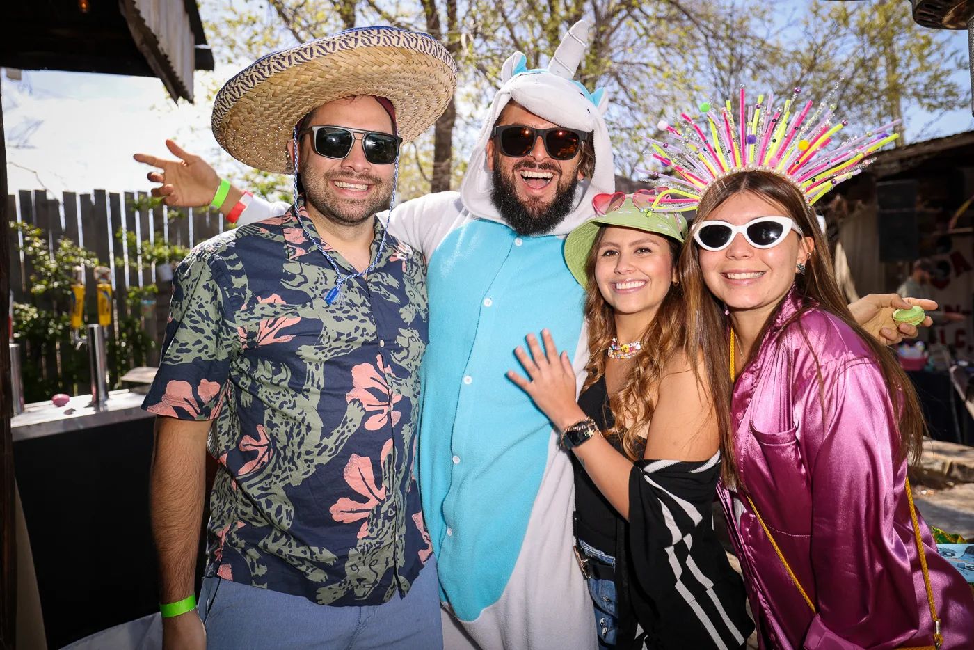 (L-R) Carlos, Felipe, G. and Camille relax near the DJ booth. Felipe is in unicorn mode right now, but stick around! He’ll unlock trippy mode soon and maybe gold naked mode before the party wraps. Photo: John Barkiple.