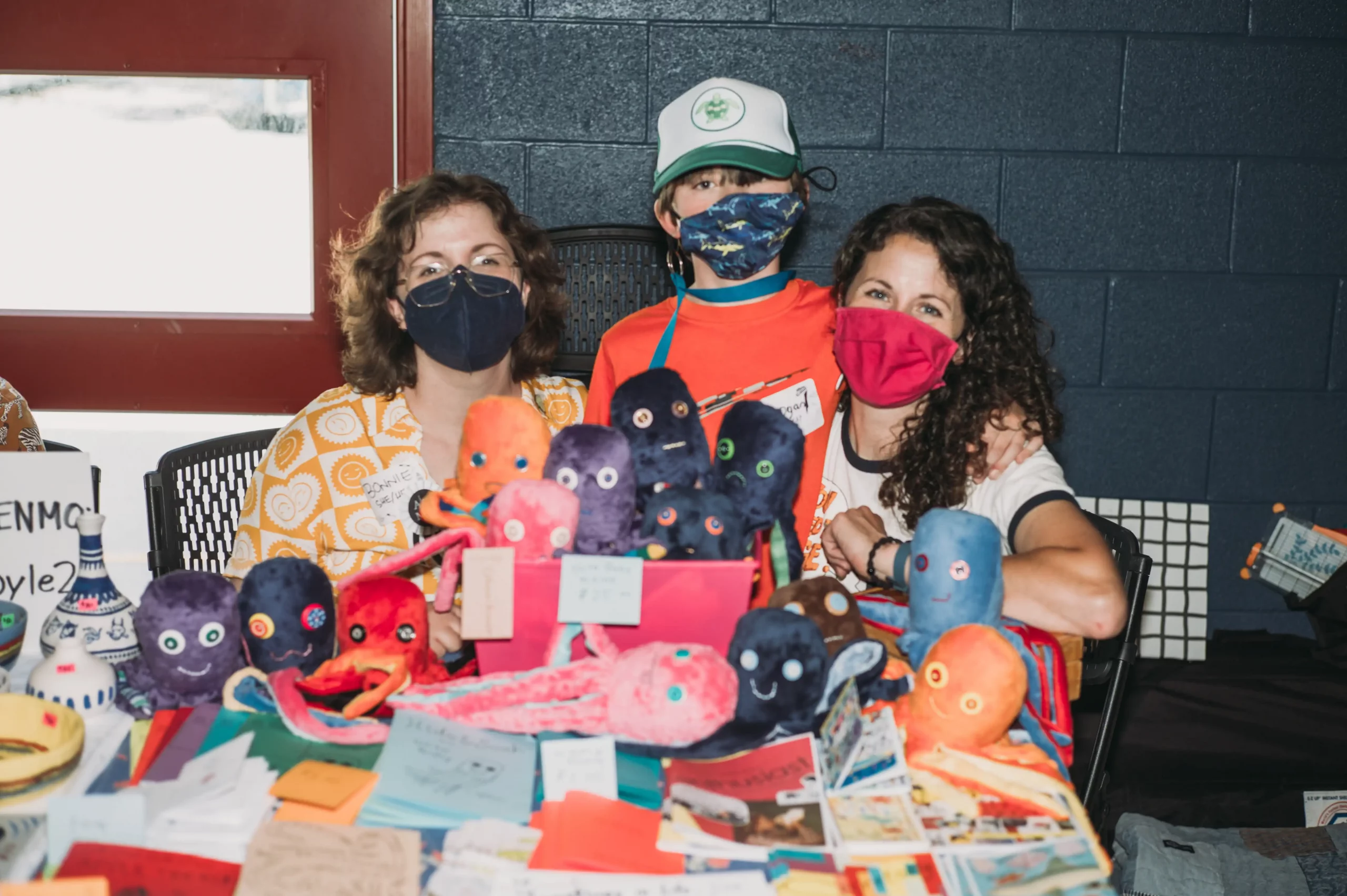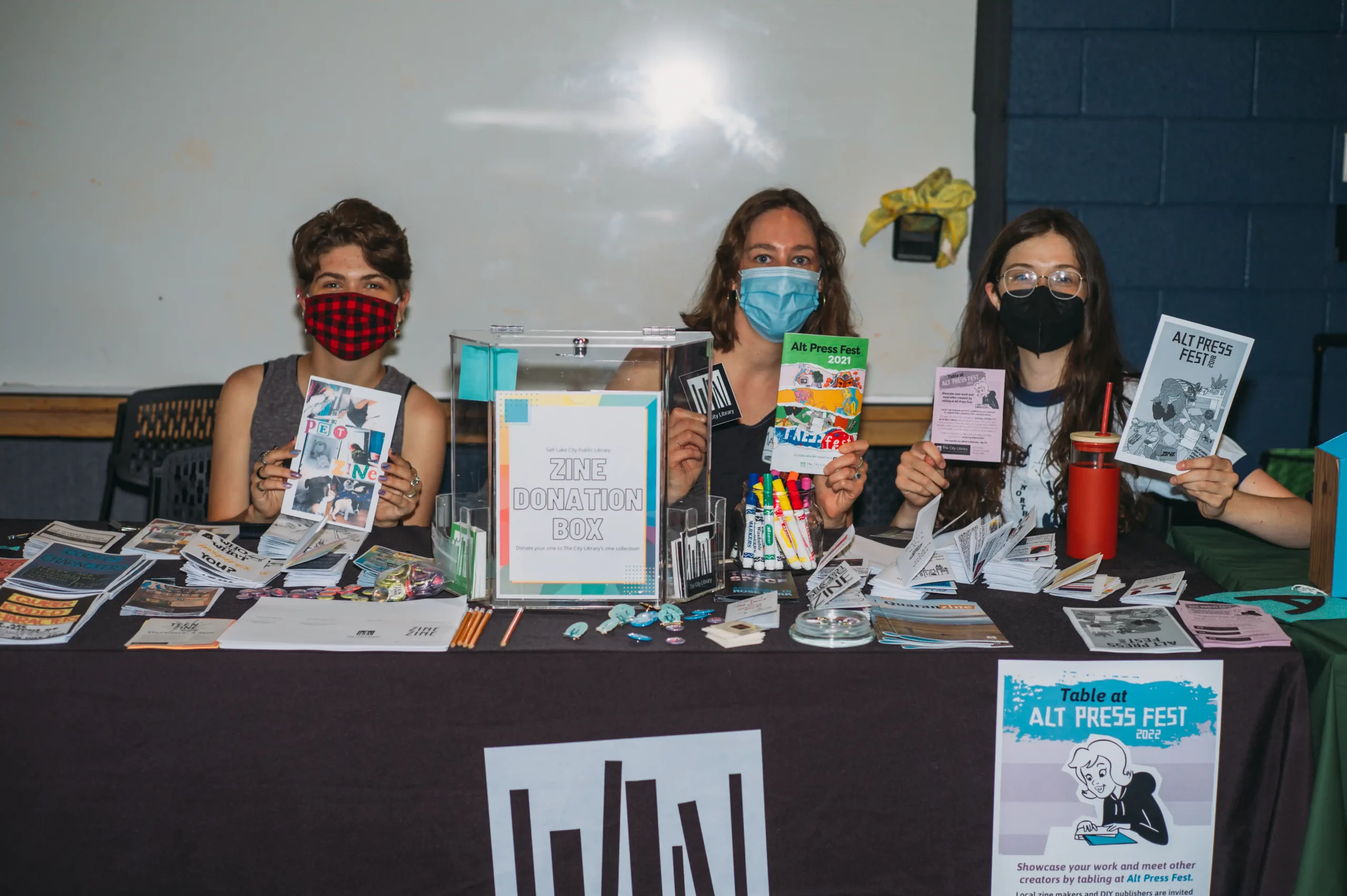 (L–R) Trin-Aber Martin, Maddie Prado and Ivy Smith with the SLC Public Library promoting their many contributions to the zine scene. (Photo: Tyson Call)