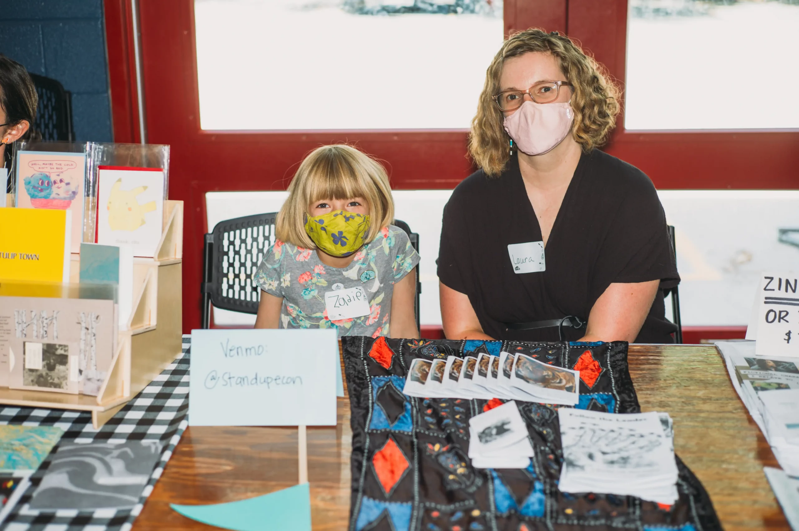 (L–R) Zadie Bauman (Zine: Animals) and Laura Gee (Zine: Follow the Leader: A Ramble with Mary Leakey and Semicolon: A Love Letter to a Much Maligned Punctuation Mark). Zadie’s third favorite animal are orcas, and even though they are scary, do not talk bad about them. Zadie’s first favorite animal is zebras. (Photo: Tyson Call)