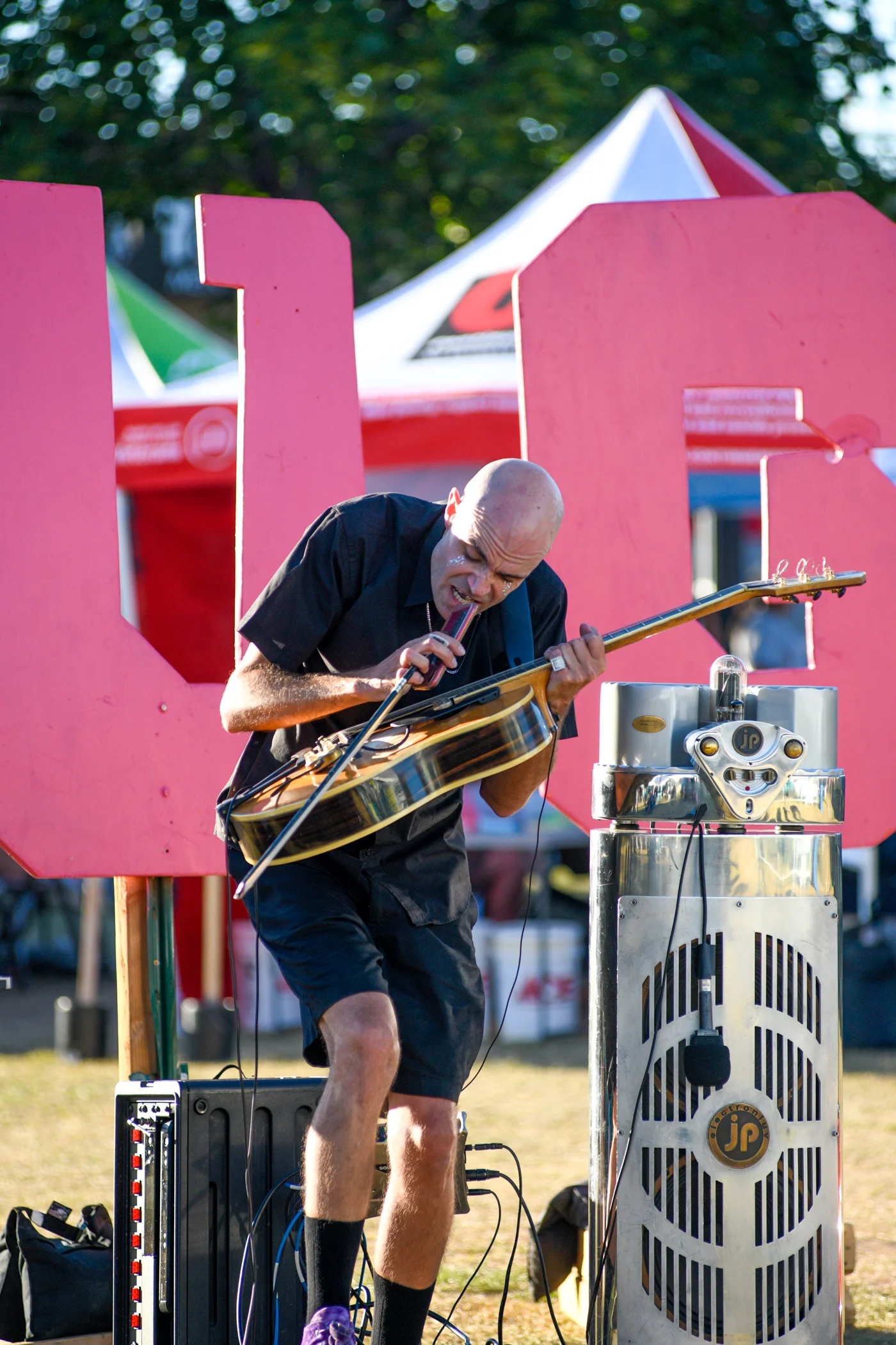 Joshua Payne Orchestra singing into his guitar to create vocal reverb. Photo: Em Behringer