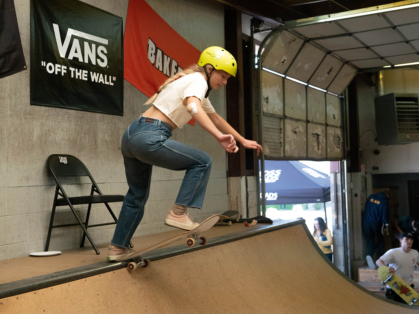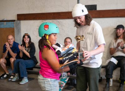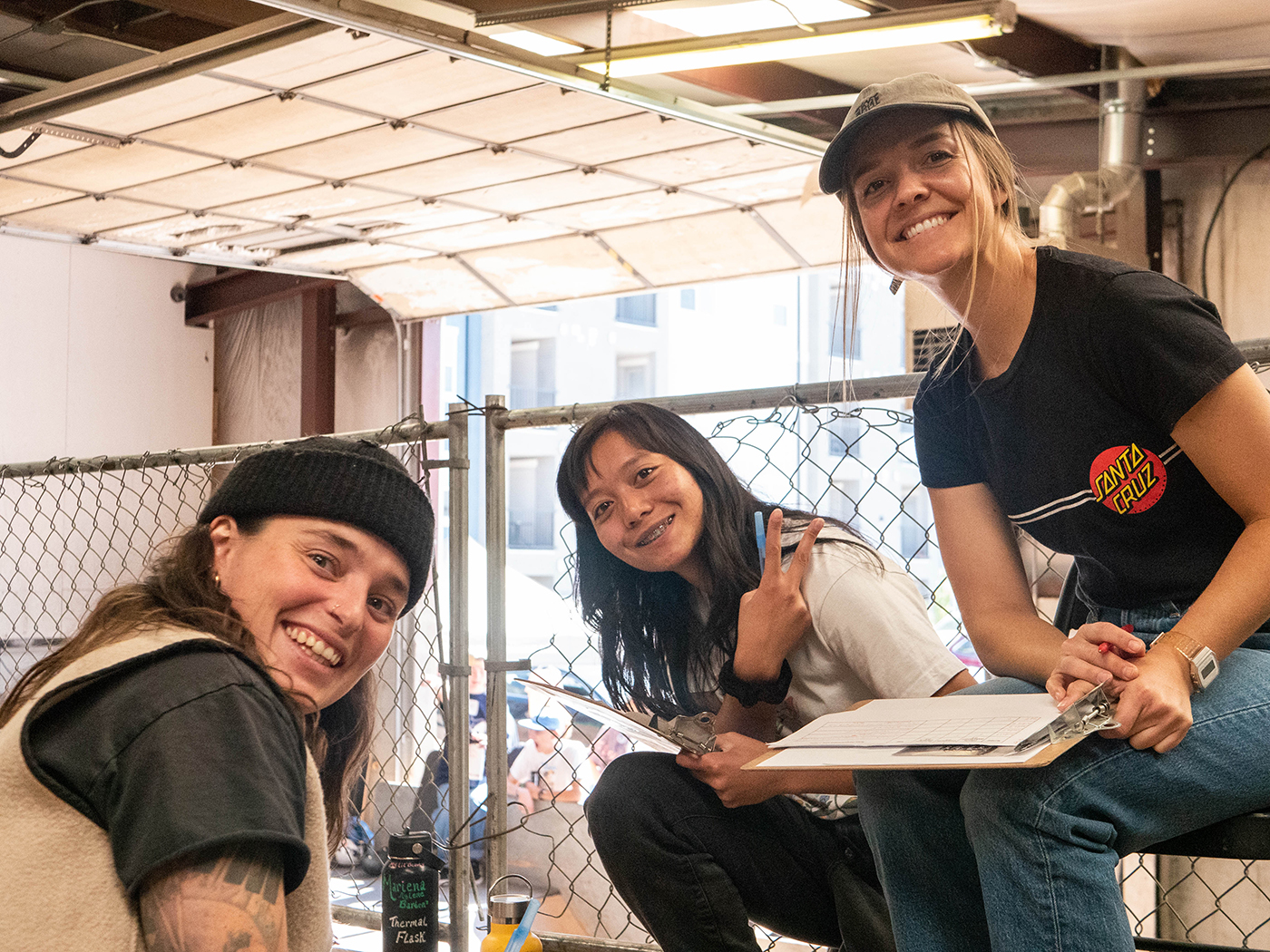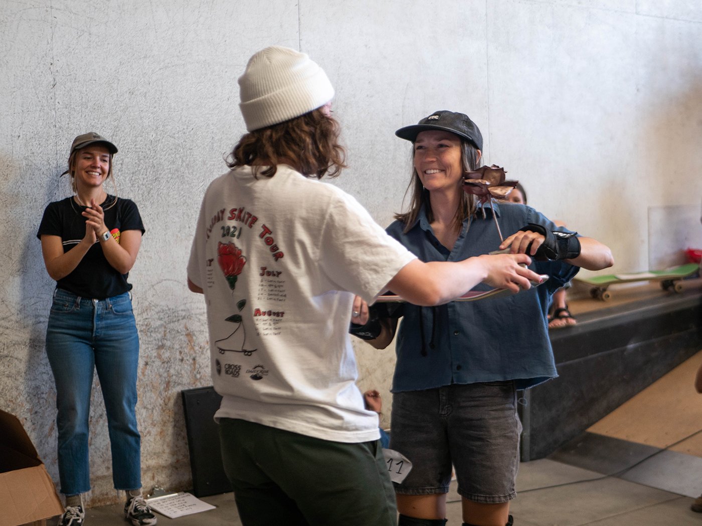 The event was split into two divisions—amateur and pro—with two heats for each division. There were no limitations on what could be skated, and the entire course was open to each girl showcasing their tricks. Once the heats started, the girls were focused and competitive, but you could hear laughter and cheering among this community-oriented group of peers. After the final heat, The Rose Club announced the winners and did not hold back with the prizes and trophies. Crafted with love, the trophies were hand-made sculptures of a rose painted in bronze, silver and gold to signify third, second and first place, respectively. Katie Morse won first place for the Pro division, Lena Garrido for the Amateur division, and Candice Jackson won Best Trick overall for a backside 5050 on the steepest, tallest quarter-pipe in sight.