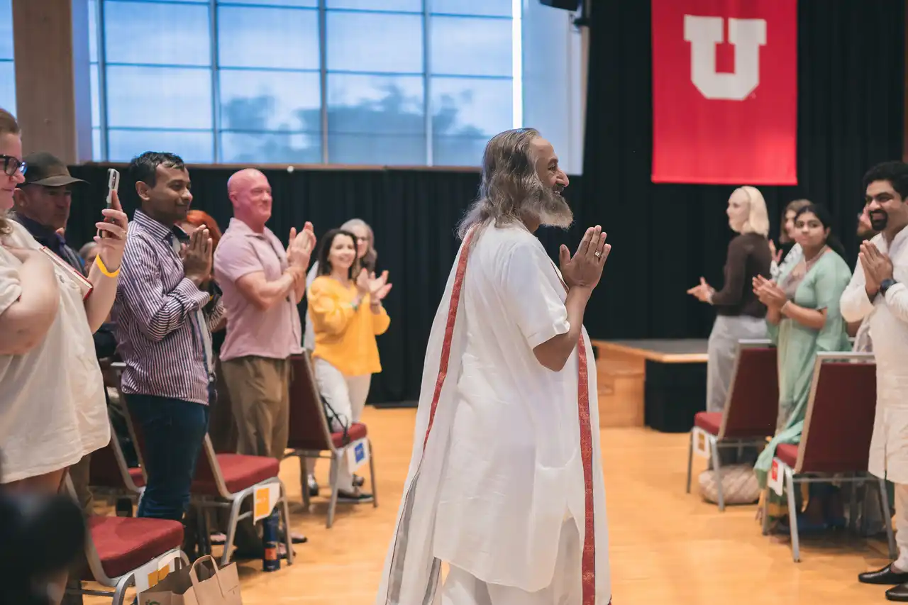 Gurudev visited Salt Lake City 16 years ago. The world has changed significantly since his last visit. Citing a statistic stating that there are now over two mass shootings a day, Gurudev expressed concerns that the world is becoming more violent. He reminded the crowd that we are “one global family.” Meditation, Gurudev explained, is a reminder of our own connectedness and humanity. By focusing and cherishing the present, it becomes impossible to blow things out of proportion or feed unnecessary anger. It is a way to turn fear into wonder, or as he says, “turn the ugly ‘I don’t know’ into the astonished and joyful ‘I don’t know.’” Inner peace and happiness translates, he says, into outer peace and happiness.