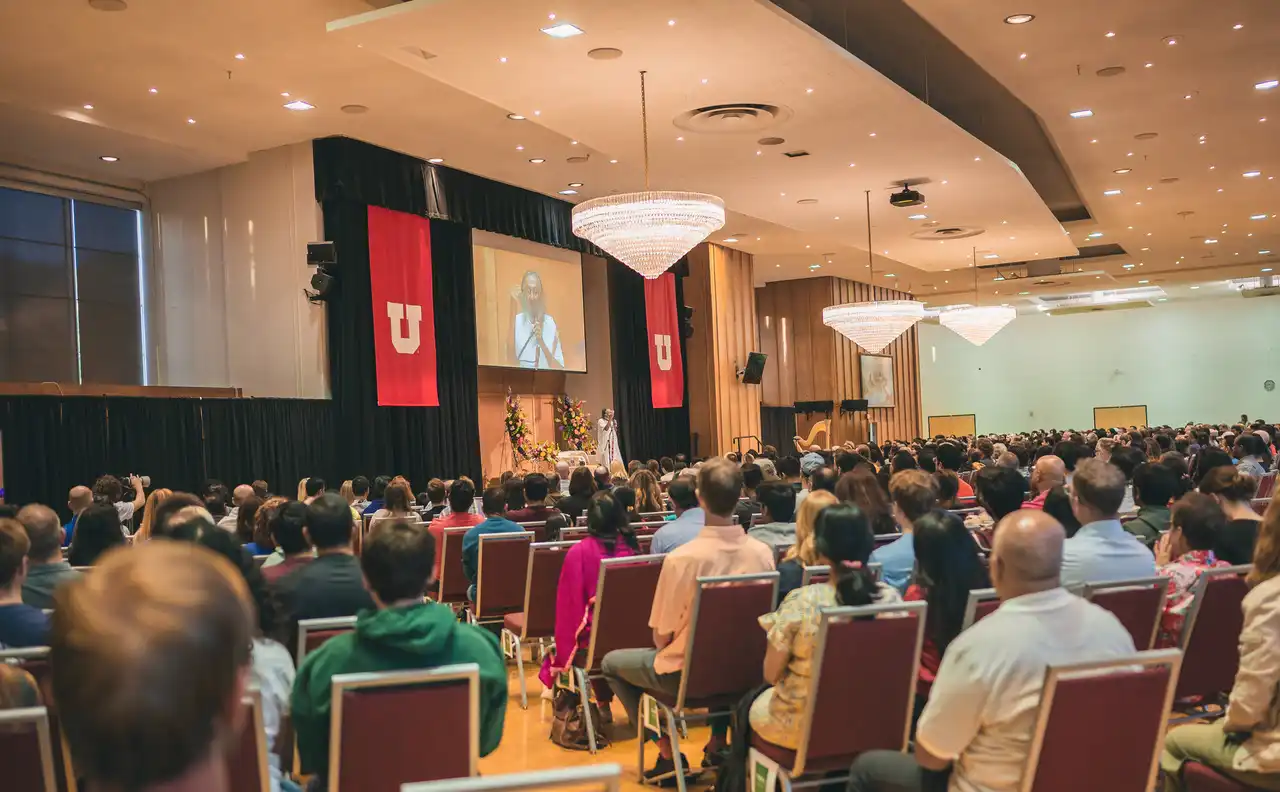 Reluctantly, I blinked my eyes open to the lights of the ballroom. I was reminded of the sheer number of people in the room and made a note of how deeply quiet we had all become during our practice. For a few minutes, a large crowd of all ages and backgrounds was united in a peaceful exploration of the spirit. On the stage, Gurudev left us with another reminder to celebrate life, to treat the unknown with wonder and awe and to live in the present.