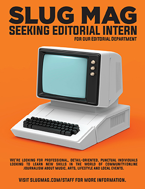 SLUG Magazine is an equal opportunity employer. SLUG Magazine will not discriminate and will take measures to ensure against discrimination in employment, recruitment, advertisements for employment, compensation, termination, upgrading, promotions, and other conditions of employment against any employee or job applicant on the bases of race, creed, color, national origin, or sex. Individuals from all cultures and communities are encouraged to apply.