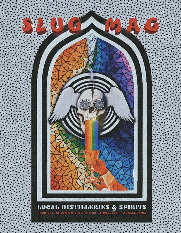 Our Local Distilleries and Spirits issue features a digital collage from Vivian Arthus, a stained glass–style assemblage that plays up the surreal and chilling connations of “spirits.” Find more of Arthus’ work @thishereticflesh on Instagram.