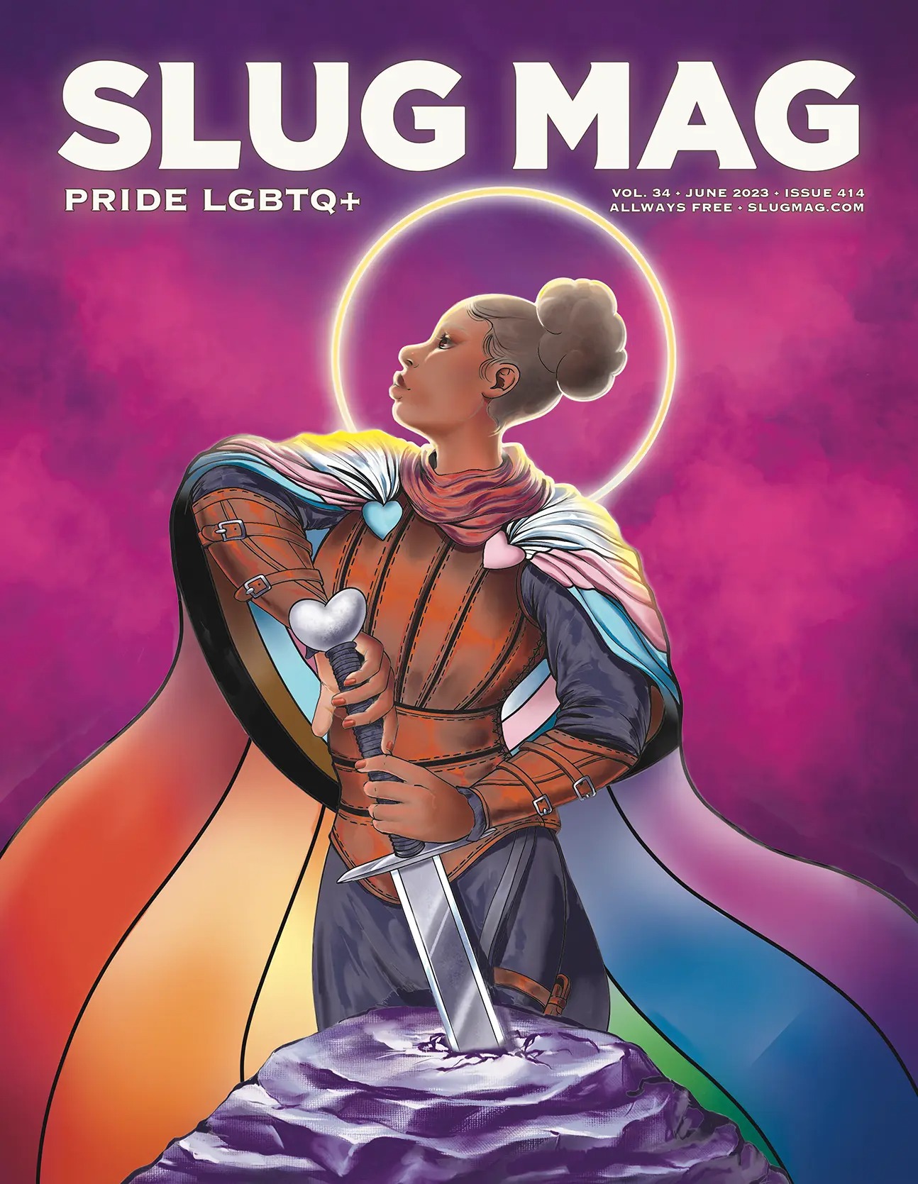 Our 2023 June Pride issue features Bea Colón drawing on the iconic imagery of King Arthur wielding Excalibur. They reserve the character’s integral pose while queering the image, reinterpreting the removal of the sword as an act of reclaiming identity. Follow Colón on Instagram @tlc.artist.