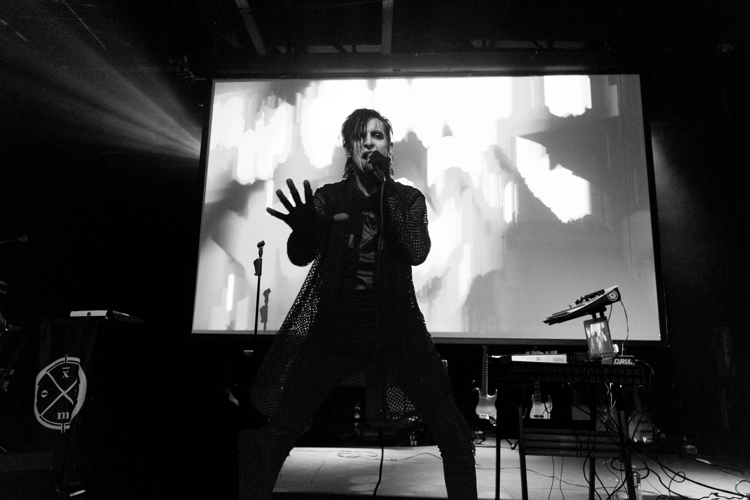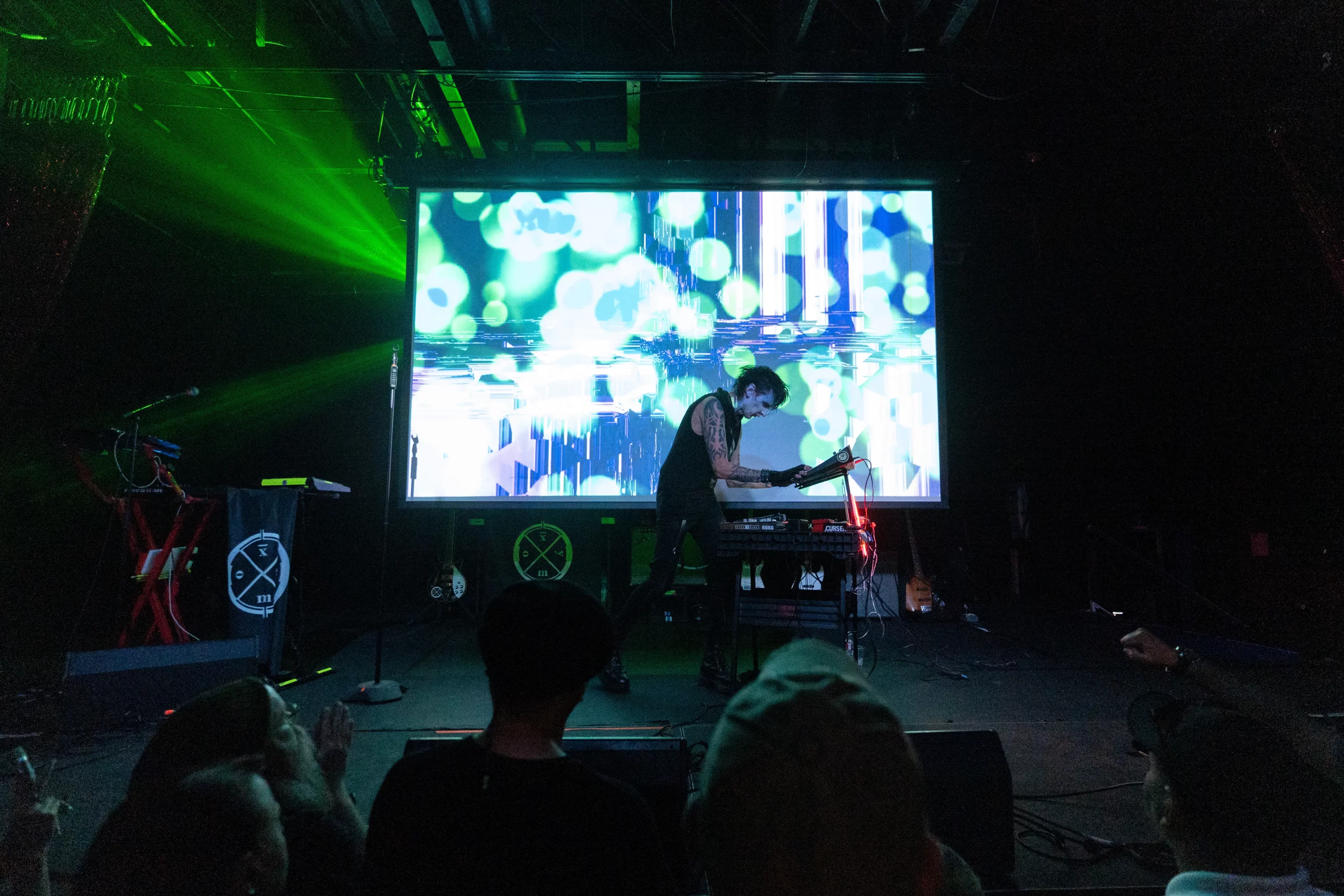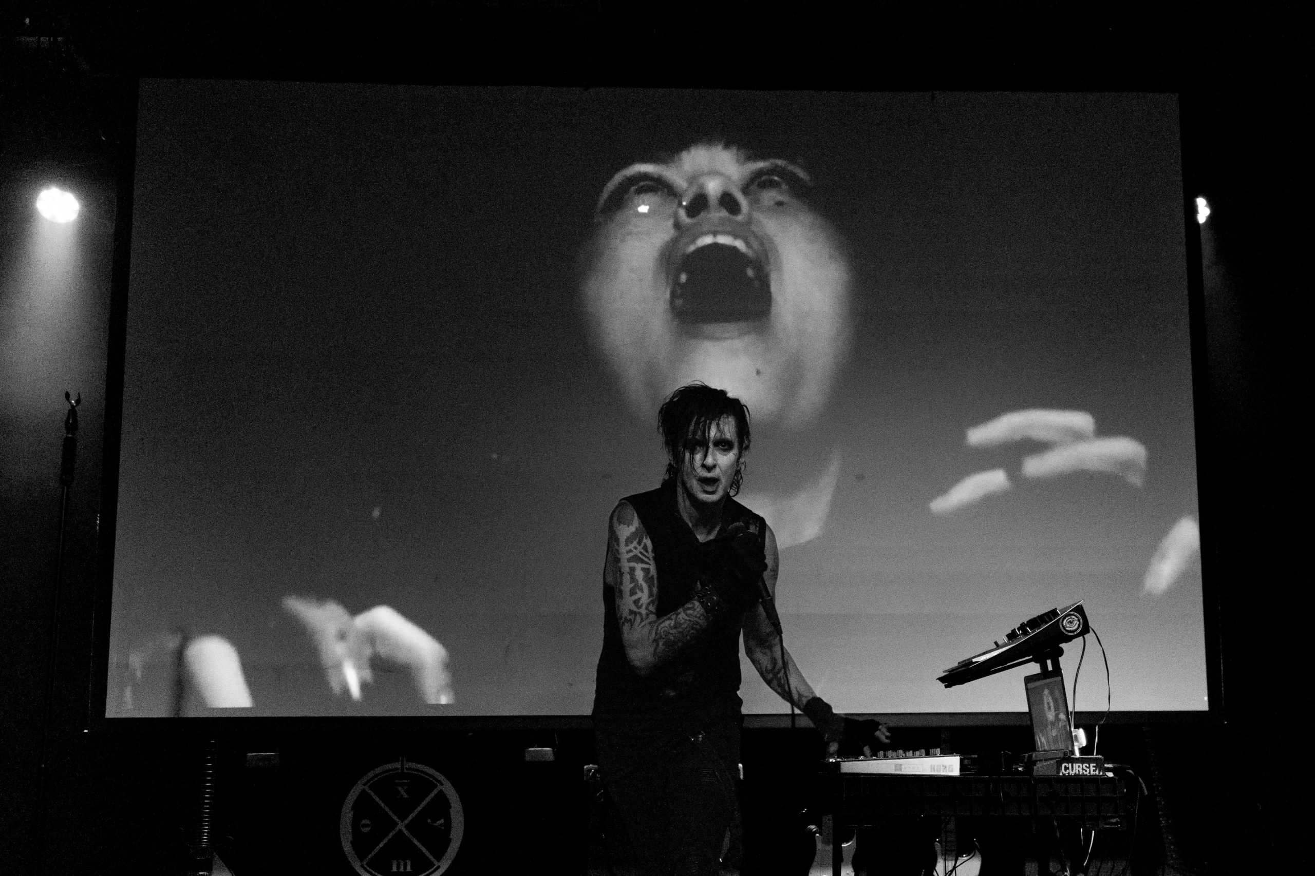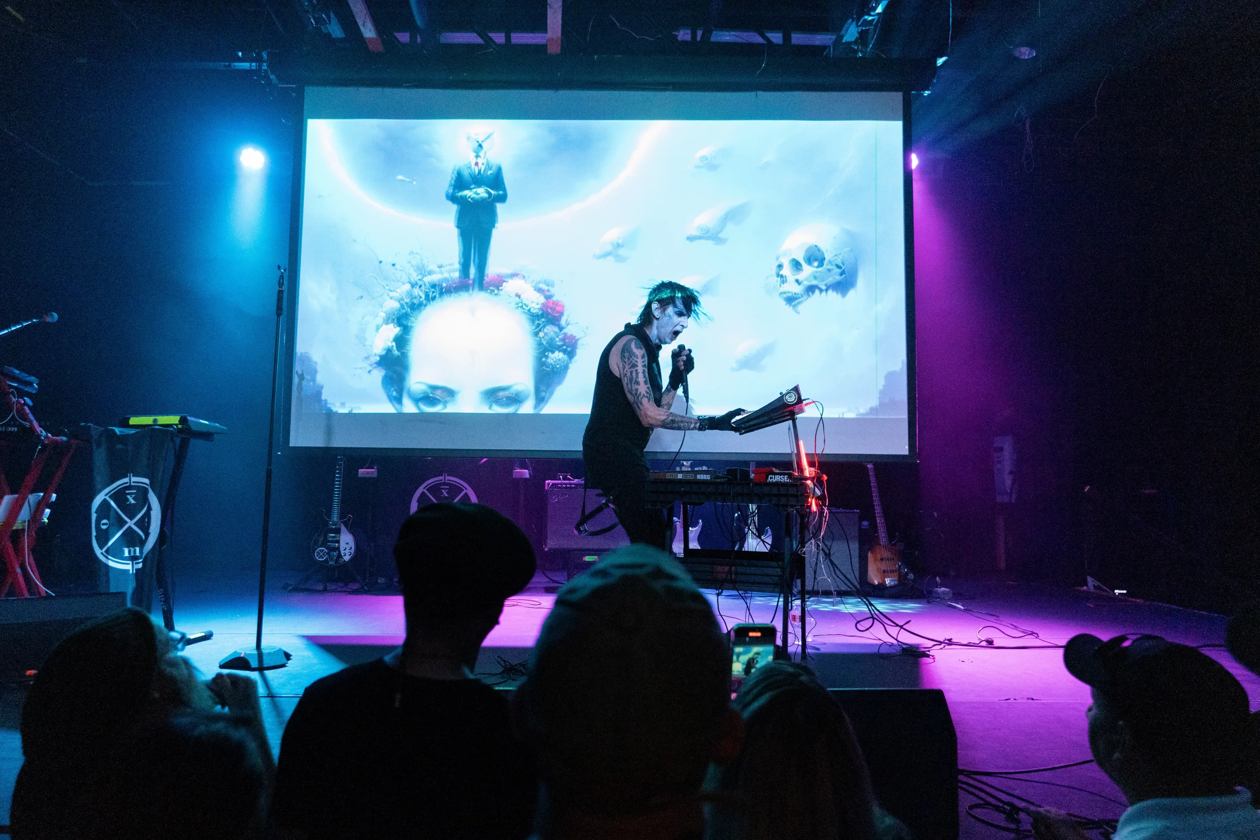 Next up is Curse Mackey, an industrial artist who melds modern dancefloor sensibilities with Skinny Puppy and ‘90s EDM influences. The makeup, the videos (none of which are AI created), the music, the stage presence and audience interactions make for an impressive multimedia experience.