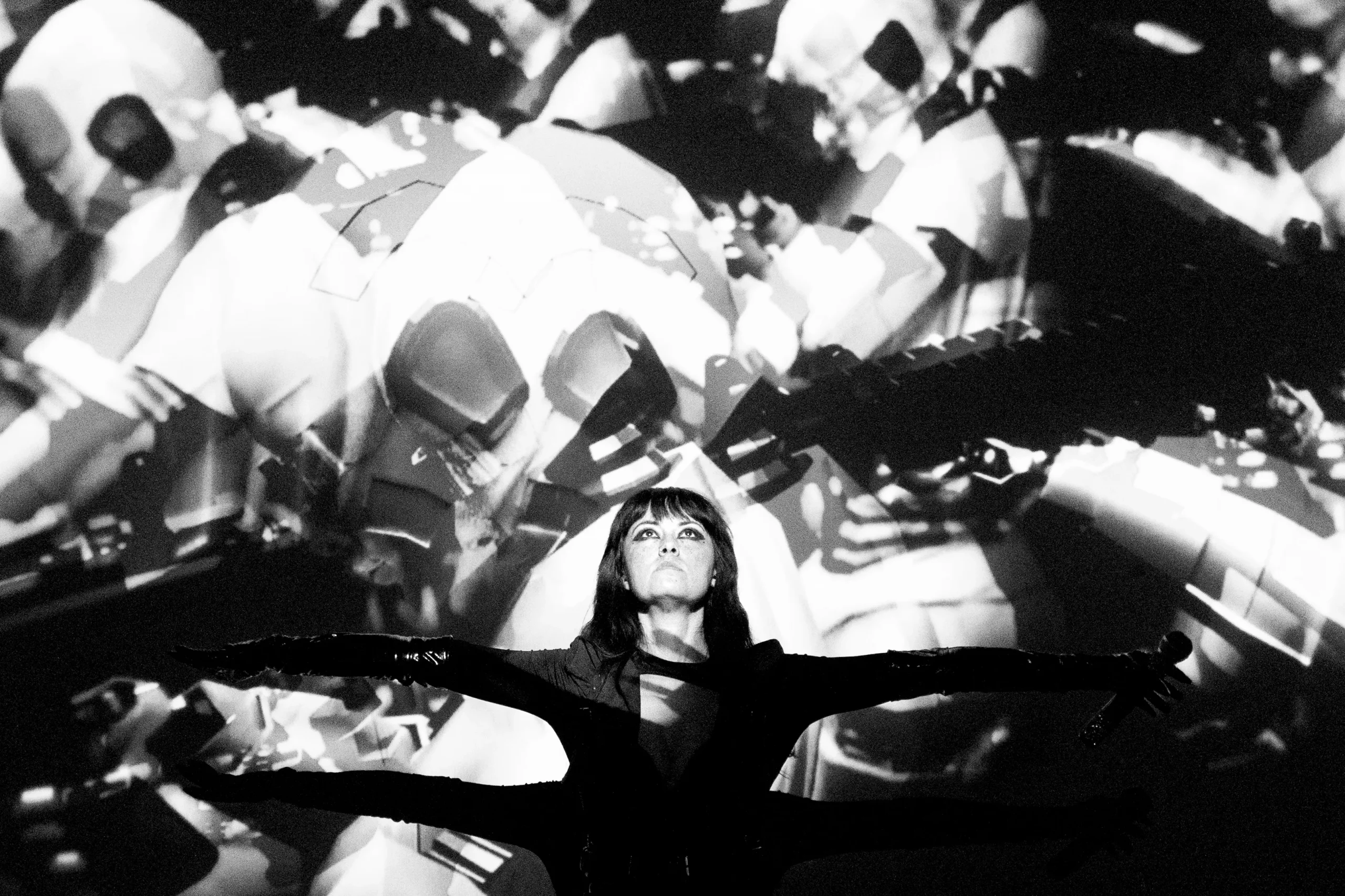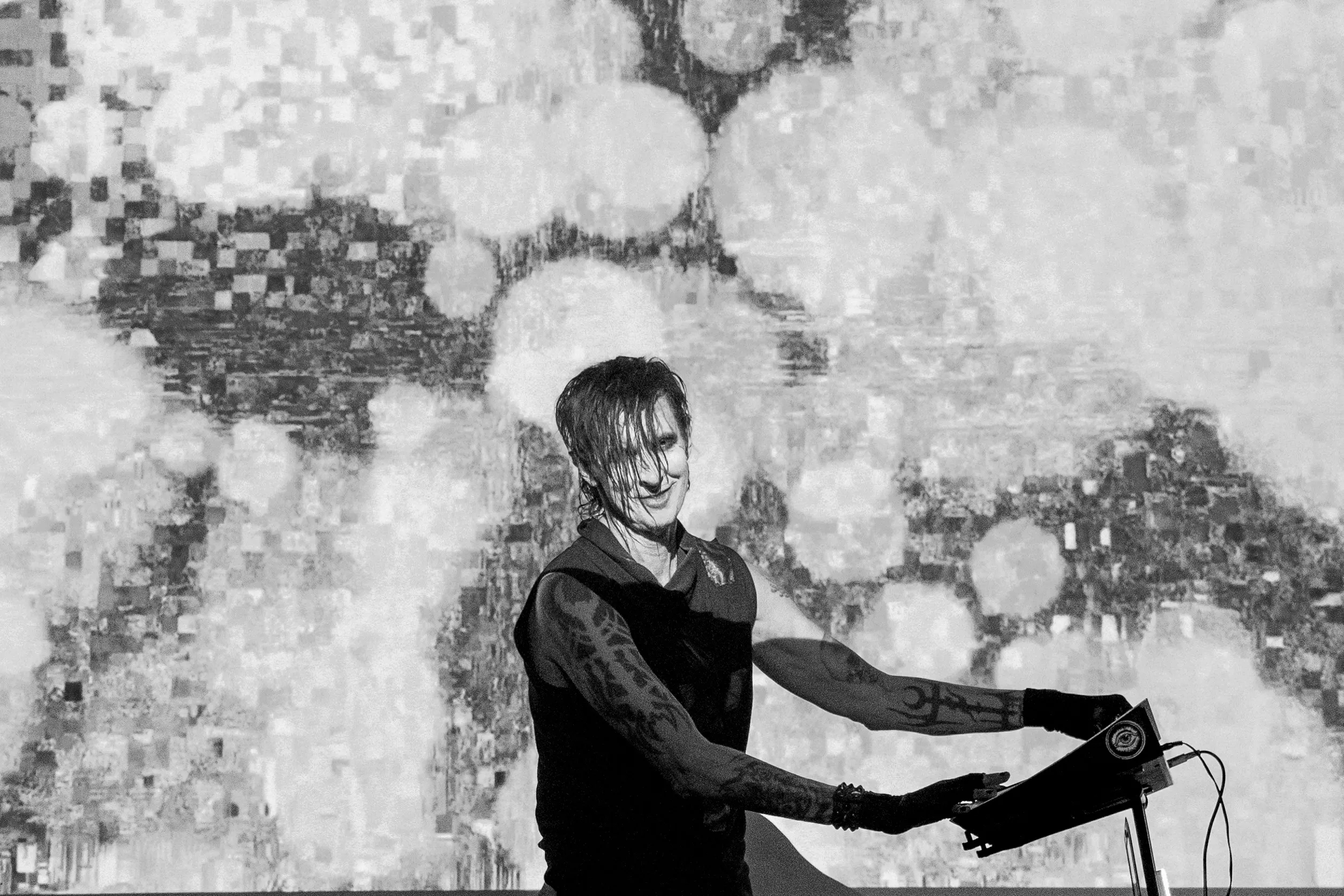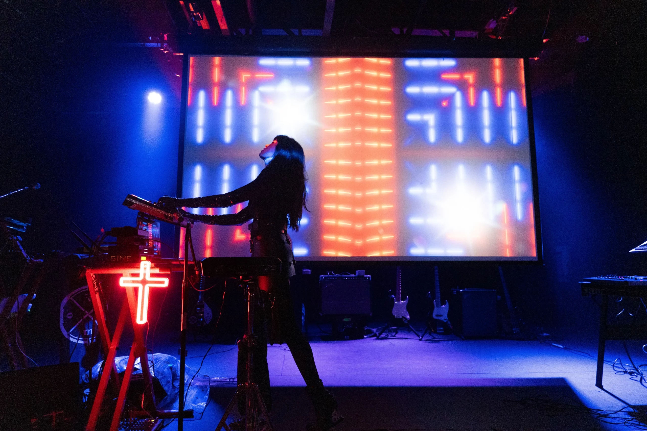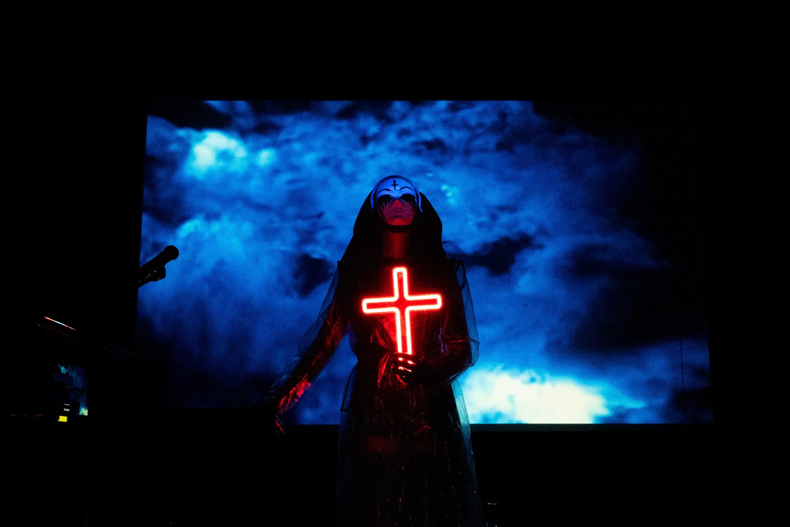 Next up is Curse Mackey, an industrial artist who melds modern dancefloor sensibilities with Skinny Puppy and ‘90s EDM influences. The makeup, the videos (none of which are AI created), the music, the stage presence and audience interactions make for an impressive multimedia experience.