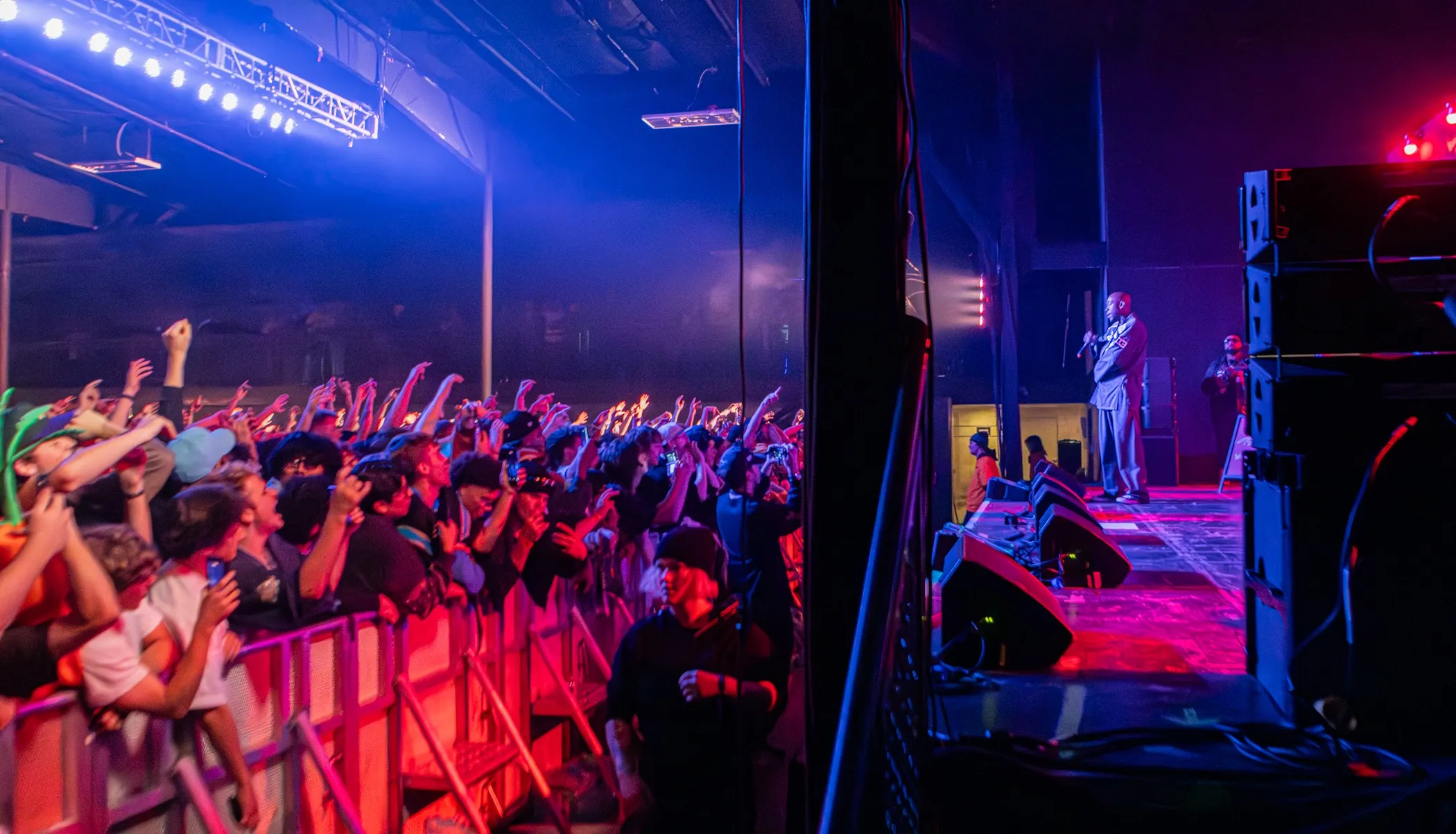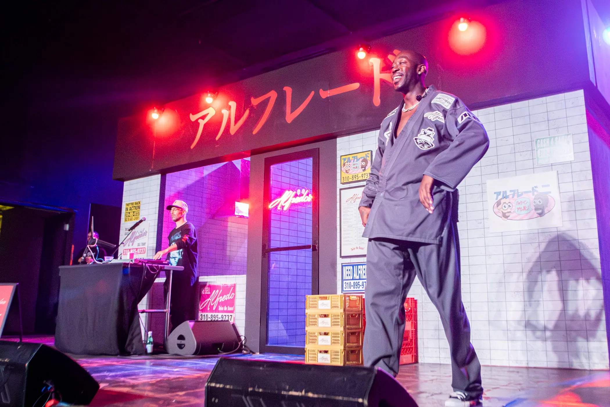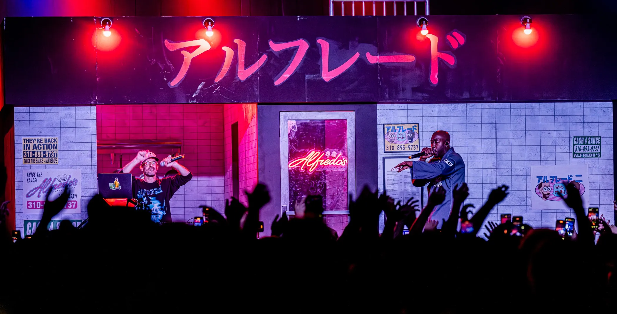 The Alfredo II tour poster depicts Gibbs’ hand grasping the globe. The Alchemist and Gibbs aren’t officially on a world tour, but they’re campaigning for another Grammy bid after Alfredo was nominated in 2021 for Best Rap Album, and the show that came to The Union had a thoroughly global feel. The first indicator was the on-stage set design, a boxy, two-level imitation of an inner-city Asian food joint with a neon “Alfredo’s” sign, providing something to look at while a DJ prepped the swelling, buzzing and semi-surprisingly youthful crowd for the night to come.