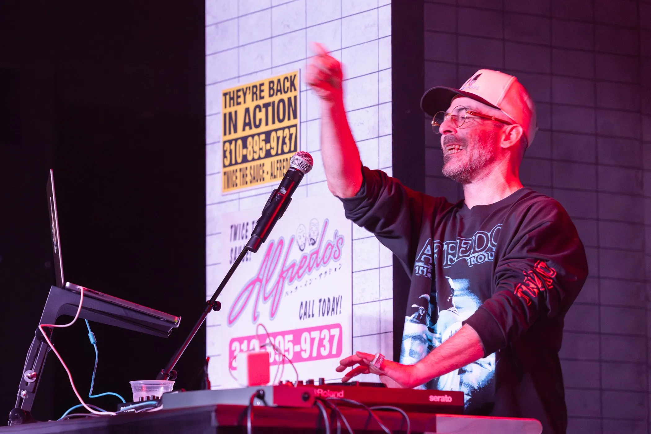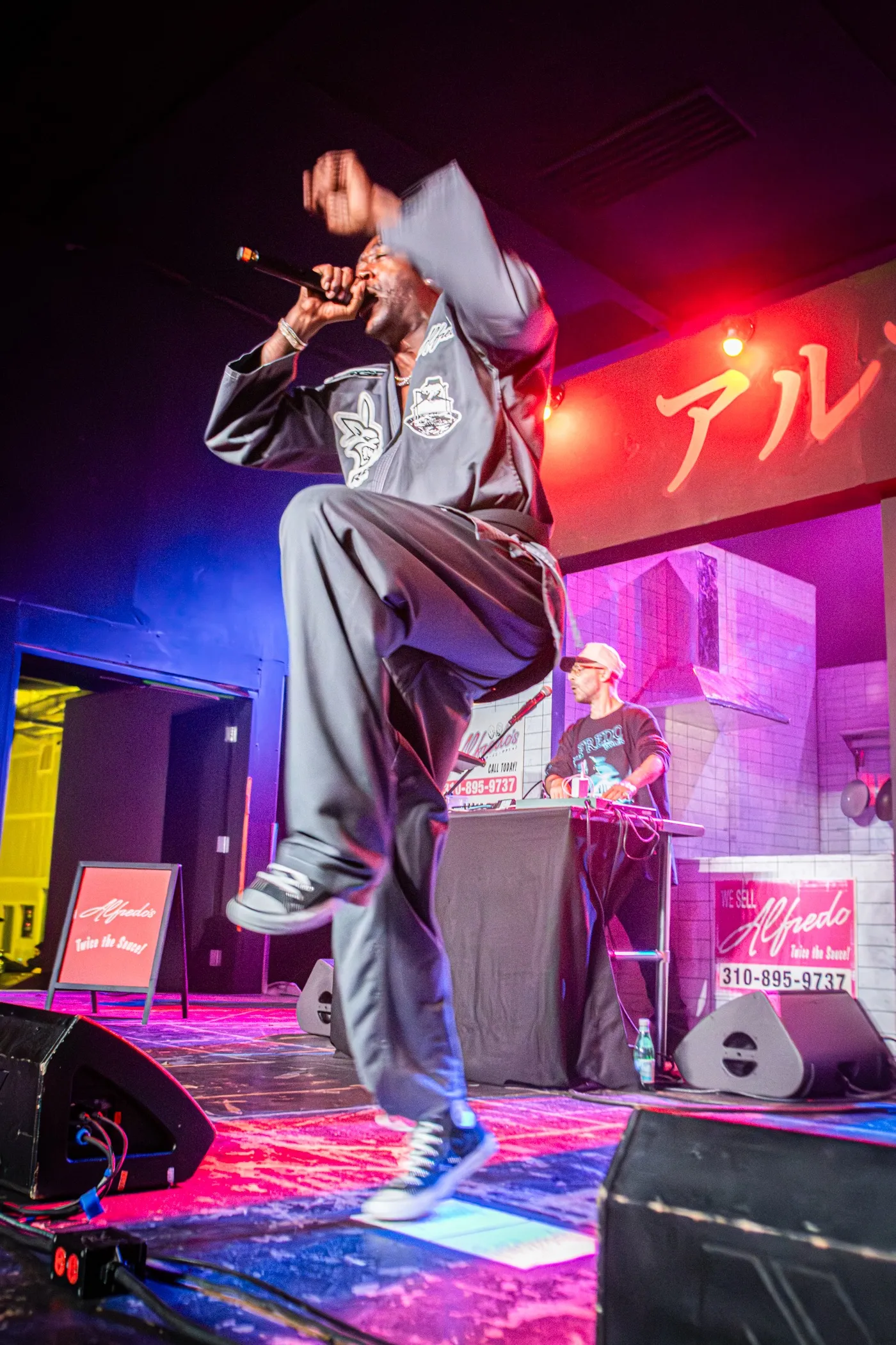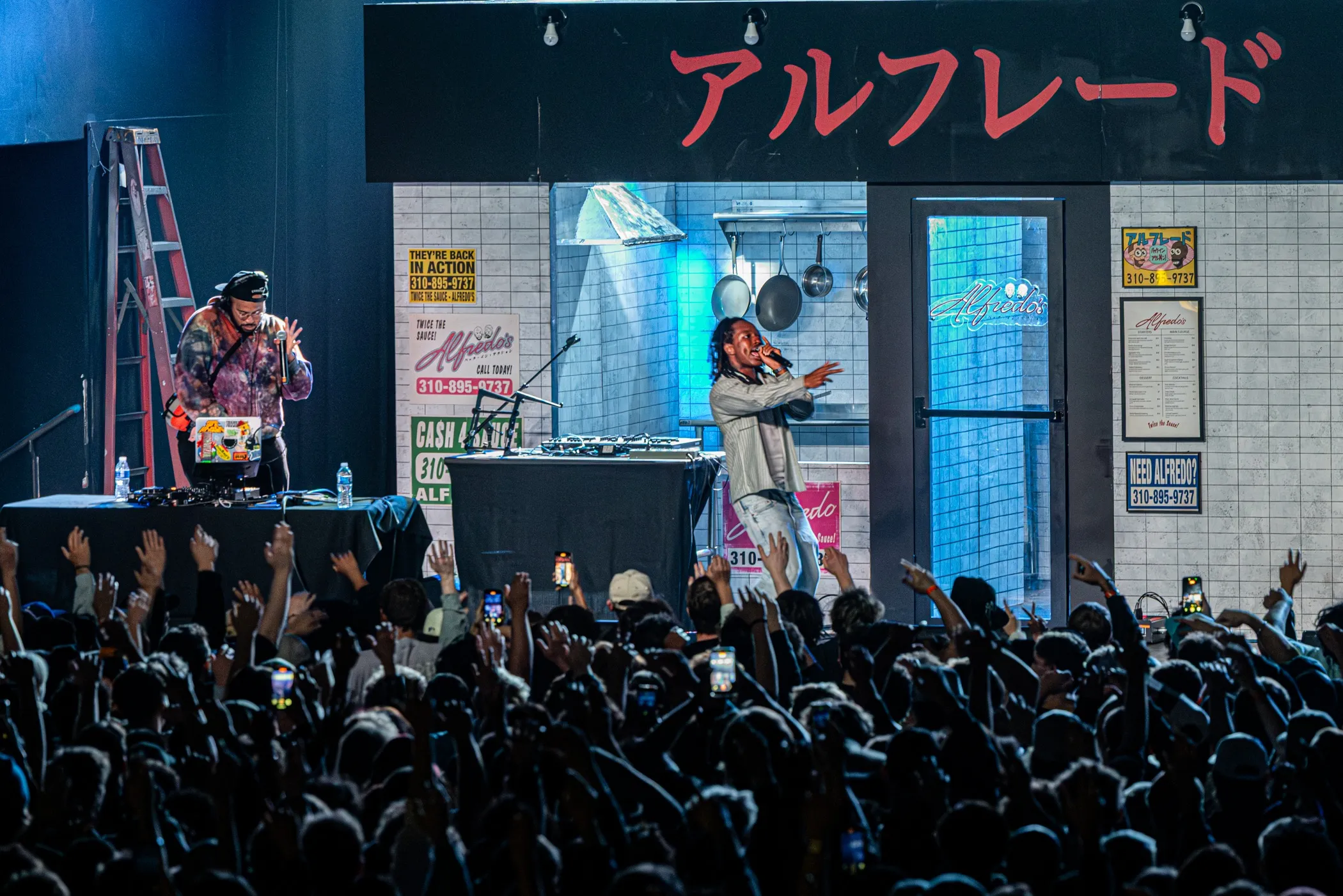 The night ensued with a mixture of hits from Alfredo and Alfredo II, with Gibbs delivering his bars word-for-word in his gravelly, hard-edged timbre, pausing only to hype up the audience, The Alchemist, and himself. At one point he disappeared, and The Alchemist went to work, chopping it up on the decks and spinning some dirty, vibey R&B bars of his own, only for Gibbs to reappear atop the restaurant set with mic in hand, rapping “Skinny Suge II” from Alfredo II.