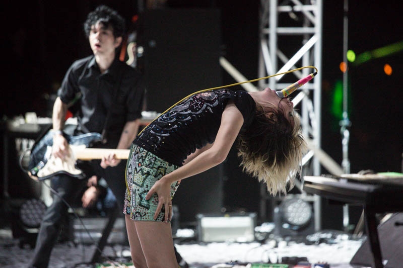 Karen O lives out every minute of her stage life like the rowdiest runway show you’ll ever see––this ain’t no mall walkway with waifs in pastel––and for this reason (OK, and because the Yeah Yeah Yeahs’ music is awesome), I find myself at the Carrie Stage on Saturday night. The YYYs’ latest album, Mosquito, has already become a go-to on my playlists, and as Karen O comes on stage in a dirty-blonde bob, sparkling pantsuit (with shorts), pink knee socks and colorful sneakers and moves right into the title track, she sucks all the energy from the thousands gathered and blasts it back in wild yelps and guttural screams.