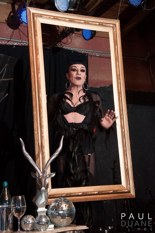 Our lovely hosts had transformed Urban into a stunningly intimate cabaret club for the evening’s performances, which, besides Arias’s, would include a showcase of Salt Lake’s emerging genderqueer artists, who loosely call themselves the Bad Kids. A backdrop of glam elegance masked Urban’s hipster-by-numbers attitude; VIP seating had eclipsed the dancefloor, a large baroque frame and candelabra hung above the stage alongside a cushioned chair and side table, Blondie and Lou Reed set the appropriate musical mood. Queer elders and young tastemakers alike filled the venue to near capacity, a crowd especially evocative of the chameleon styles of contemporary drag culture. It was truly set to be a gem of a night inspired by the glitz of New York clubs like Joe’s Pub, where Arias recently spent a short residency in preparation for the upcoming tour.
