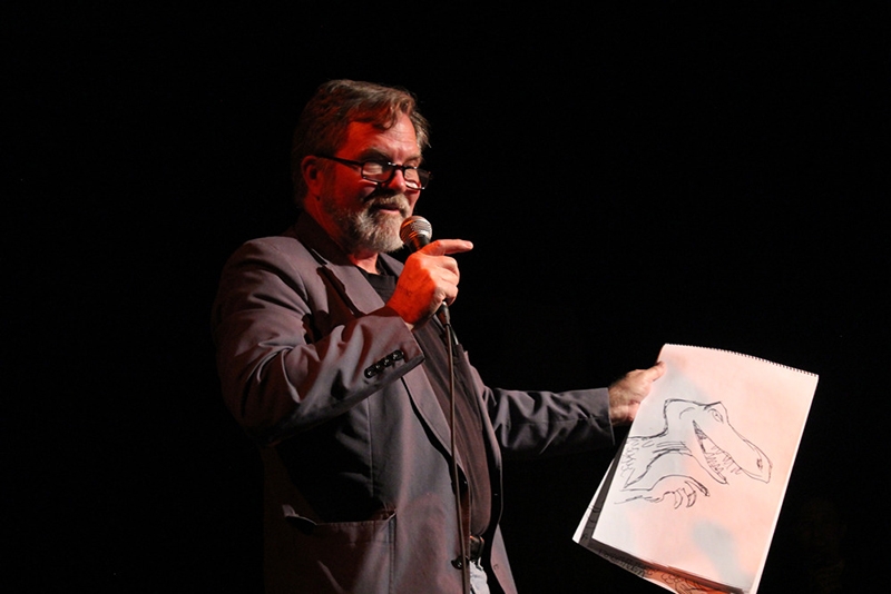The three judges for the night included Alex Caldiero, poet, sonosopher and scholar of Humanities; Jean Howard, performer, producer and poet; and Pat Bagley, notable cartoonist from The Salt Lake Tribune. The style of judging varied widely between the trio, lacking any sort of predictability or dryness—a welcome feat. Caldiero played the troubled artist with his mind travelling faster than the speed it takes to talk, focusing on the themes and messages of the authors, while Howard seemed to focus on the physical elements most. Bagley took a different approach entirely, making cartoons out of the performances. The authors are given seven minutes to perform, so although the drawings were hasty, the ease with which he captured elements of their fight was impressive.