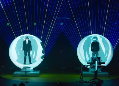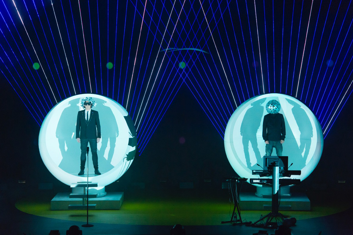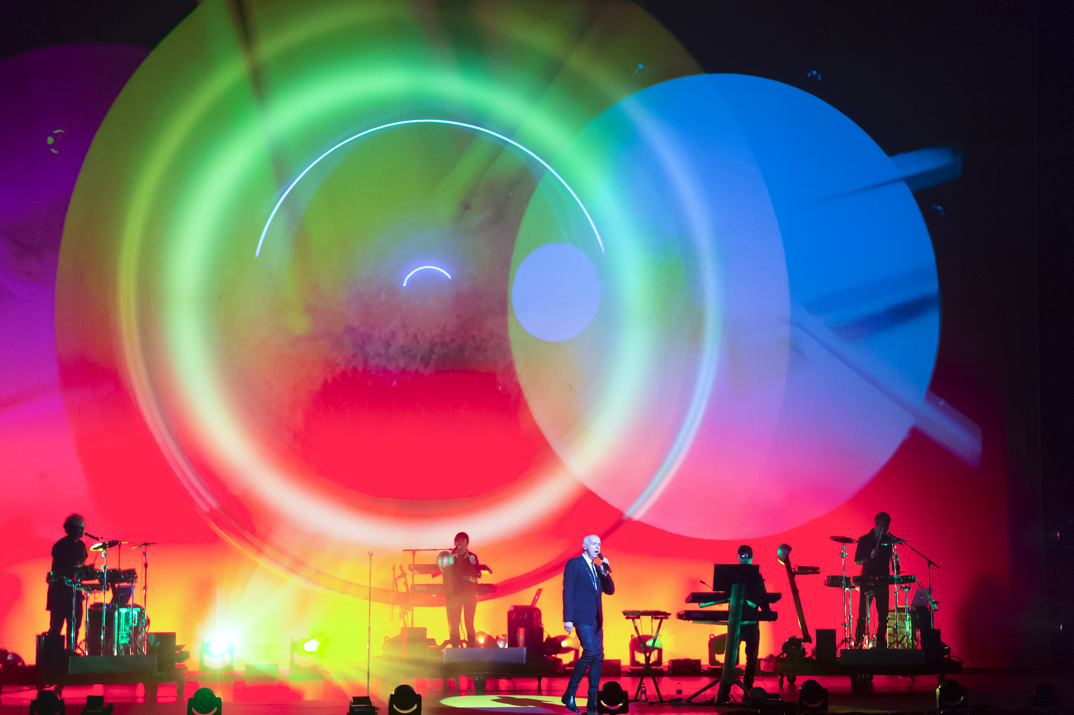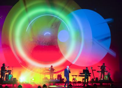 First up was the stage featuring minimalist set pieces—designed and conceptualized again by the stellar Es Devlin—intriguingly beckoning from their pre-show setup. White dimensional spheres (this circular theme has seamlessly been repeated through all of the Super era’s releases, from album, singles, posters, shirts and tour book) flanked both sides of Lowe’s synth and keyboard tower and appeared to possibly be for projections. That turned out to be so only for the first few darkly enticing throbs of “Inner Sanctum” before they thrillingly rotated to reveal Tennant and Lowe, in awesome metallic headpieces, no less, to an adoring mass of their fans.