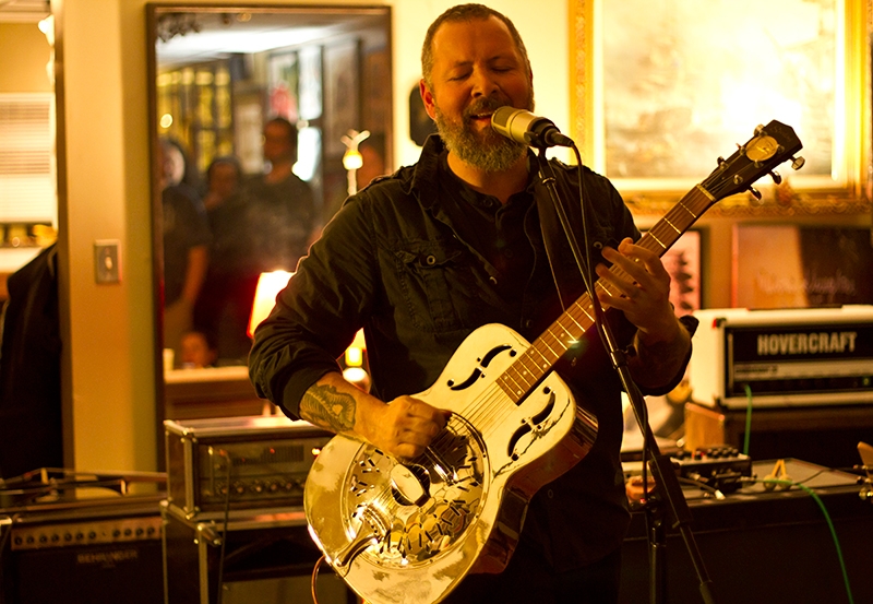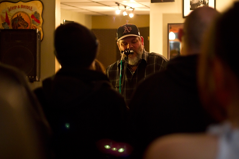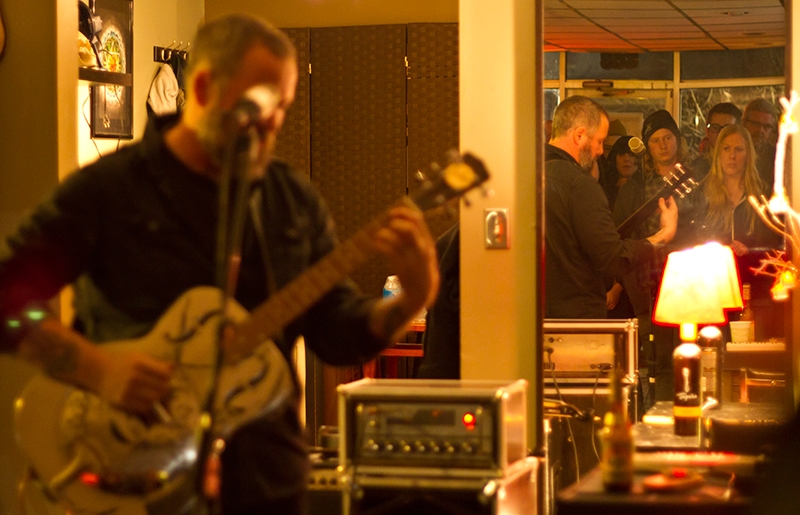 Scott Kelly and the Road Home jumped right into the first song without a word, immediately silencing the mingling crowd. Their setlist consisted of mainly melancholy songs off of their album The Forgiven Ghost In Me. Like the two preceding bands, Kelly of Neurosis kept the between-song banter to a minimum, distinguishing this show from a conversation-driven coffee shop performance. As the show progressed, the amount somber faces in the audience surrounding me became abundant. The musicians had everyone in a trance, only broken by a telephone call perfectly timed with the fade of an ending song. The answering machine of the tattoo shop recited store hours and restored smiles to all the gloomy faces.