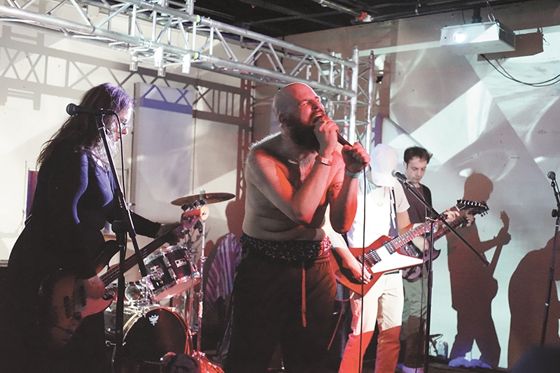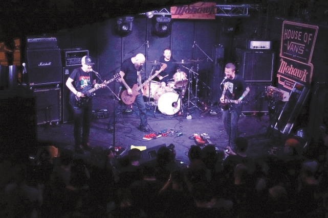 Maybe it’s the theatre stage of the nondescript venue, The Hideout, and its dark, bohemian atmosphere, but Protomartyr deliver something transcendent. Frontman vocalist Joe Casey looks like a dad in his pleated pants and tucked-in, buttoned-up shirt with a white undershirt. His vocals are shouts, which he punctuates with correlating scowls, and the words he spits paint pictures of dark street corners, perhaps of Detroit, their hometown (where, Casey noted, they don’t have roundabouts). Guitarist Greg Ahee looks as though he could be Casey’s son, and bassist Scott Davidson and drummer Scott Leonard look like potential neighborhood kids onstage in a showing that comes across more like a play than a rock set. Casey loosens to a deep croon from his bitter half-snarls and sings in a baritone atop Ahee’s angular, wistful guitar work. The singer scrunches up his face expressively, and it’s in his performance that Protomartyr’s set becomes something like a rock-musicalized poetry reading without the effects of slam poetry, yet also without the graceless flurry of mosh pit dancers. Though their set is enigmatic, there’s something charmingly artless about the way in which Protomartyr deliver their music; they lie somewhere between the post-punk of Gang of Four’s more severe moments and the less vitriolic moments of Damaged by Black Flag. Their songs each stand on their own, but it seems that (no matter in which order they’re placed in a set, seemingly) their songs culminate in a synergistic wallop, which invokes grit and greyness and the warehouses in their blighted Michigan home city. As they sidled into what might have been their last song of the evening, something in Ahee’s guitar/pedal/amp setup shorted out, and Casey smiled to let the crowd know that they were done. With a wave of his hand, the act was over. –Alexander Ortega
