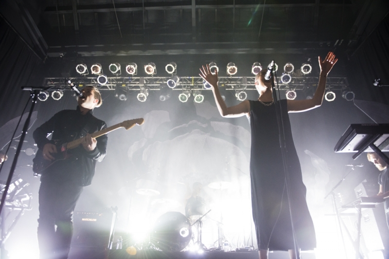 The venue rolled in black; I’m surprised no one passed out for screaming so long and loud. Alisa Xayalith, Thom Powers, Aaron Short, David Beadle and Jesse Wood took the stage tailoring their set to their obsession with black and white—white lights, black clothes and what seemed like hanging shapes of New Zealand lit up in blue. Powers and Xayalith were in the front, Short, Beadle, and Wood scattered behind them. They were spread out, leaving each his/her own space to embrace the atmosphere of a sold out show and the crowds that pushed forward cheering when they started playing “A Stillness,” the first track on their new album, In Rolling Waves, immediately transitioning into “Girls Like You,” from Passive Me, Aggressive You, which everyone knew the words to. Following, they played “Hearts Like Ours,” from In Rolling Waves. The Naked and Famous had a balanced performance between old and new songs.
