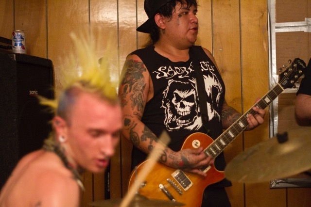 A few skaters took on the half pipe as some people sat on the ground enjoying the last warm rays of sunshine between sets. Salt Lake City noisecore band Discoid A turned up the heat with an even wilder display of thrashing around the room, instruments be damned. With Raunch Records owner Brad Collins on drums, Callirgos on guitar and vocals and Discoid Sam doing double duty on bass and vocals, the crowd grew in numbers and in ferocity. The room was now too full of sweaty bodies to maintain the semicircle and few were safe from the assault of flailing limbs. A handful of people managed to obtain a collision-free spot atop a stair leading into the kitchen beneath an American flag. Like Steve Buscemi, the majority of Discoid A’s songs were less than a minute. Luckily, they had enough material to satisfy the rowdy fiends in the audience.