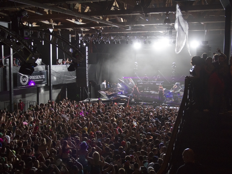 Candyland is up next, but due to a couple of drinks already in my system I feel the need to empty my bladder. I am dreading the bathroom because I know it will be packed with goons carrying around that special odor. As I enter, I notice that there is a pleasant addition to the restroom—staff. In my time away from raves, the management at the Saltair must have realized that they need to keep an eye on the bathroom in order to keep people safe. As I am walking out of the restroom, the duo from Santa Barbara takes the stage. Only Josie is on stage, while Ethan—who does most of the production—is nowhere in sight. They have plenty of build-ups leading the crowd to their nasty drops. Josie has an afro with a mind of its own, bouncing up and down as she tells the crowd to jump. Samples of “Gangsta’s Paradise” by Coolio and “Get Low” by Lil Jon get the crowd hyped in between drops. As Candyland end their set, I start thinking to myself, “Why did I ever stop going to these?”