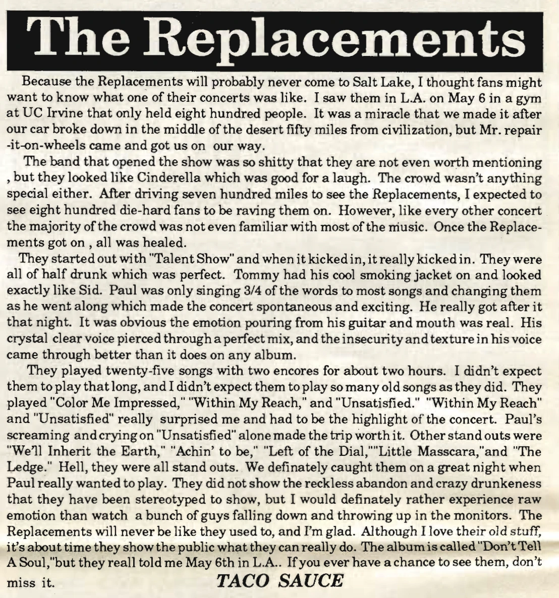 Because The Replacements will probably never come to Salt Lake, I thought fans might want to know what one of their concerts was like. I saw them in L.A. on May 6 in a gym at UC Irvine that only held 800 people. It was a miracle that we made it after our car broke down in the middle of the desert 50 miles from civilization, but Mr. Repair-it-on-wheels came and got us on our way.