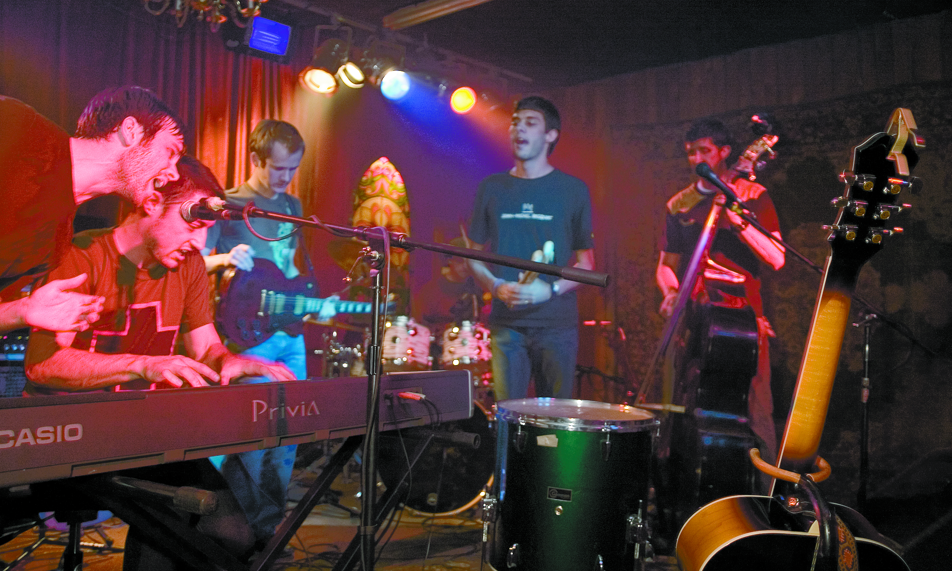 Kid Theodore’s influences are quite eclectic, and with nearly every member of the band being a multi-instrumentalist, each song is distinct and has its own personality. Ryan Darton said that every Kid Theodore song starts with one person writing it, “Then everyone else jumps on it and turns it into something new.” Kid Theodore’s instrumentation also sets them apart from the pack, as they use an upright bass and make liberal use of various types of percussion from cookie sheets to hand-claps. While most of the band’s members weren’t necessarily going out of their way to create an eclectic sound, Brandon McBride sought to become a master of such off-kilter instruments as the cookie sheet, bike bell and accordion to add a unique element to Kid Theodore’s sound.
