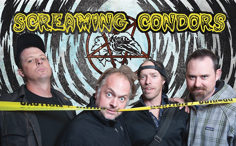The Screaming Condors’ origin can be traced back roughly to 2004 and a group called Hot Buttered Fart Pumper (HBFP). John Paterson and Greg Hillis got their start playing guitars together in HBFP, which would later become Screaming Condors. After about a year, enough time for Screaming Condors to get serious, the original bass player and drummer left. Sam Compton, a local drummer who was friends with Hillis and Paterson and had jammed with them in Hillis’ basement, saw their potential and was interested in joining. Compton says, “I kind of came in and was like, ‘Yeah, I’ve got a bass player buddy, too.’ So, I brought Tige [Campbell] over, and it just happened instantly,” which locked in the rhythm section to solidify the band. Campbell and Compton had played in a lot of other bands together, and so had Paterson and Hillis. “We just kind of united,” says Campbell. Screaming Condors have been playing with their lineup dynamic for five years now.