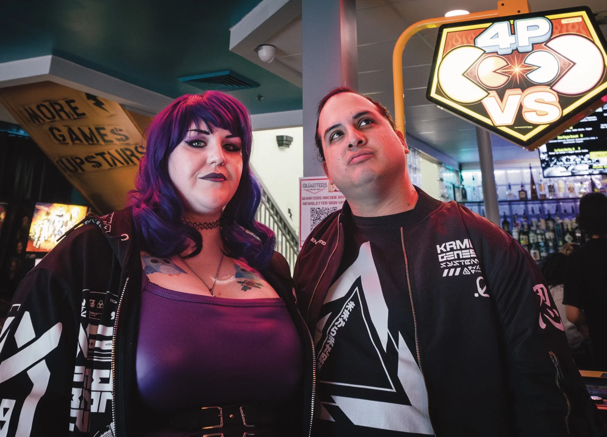 I stepped away from the gorgeous, sunny day outside and into the dark, neon-tinged Quarters Arcade Bar in Sugarhouse to find Chris Herrera and Lizz Blount, the duo behind Runestomper. Clad in matching black bomber jackets and looking like they stepped out of a cyberpunk movie, it was they who actually asked the first question: “What kind of music do you like?” I said I’ve been listening to a lot of The Killers’ Hot Fuss lately, and they immediately nodded in agreement and started talking about how much they love that album before listing off their favorites that go from Periphery and Kendrick Lamar to Ozzy Osbourne to HIM to Elvis Presley. It was clear the two loved music deeply, and that came through as well with how they got their starts in music.